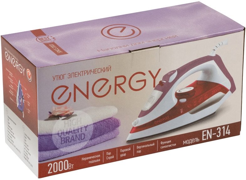 Паровой утюг ENERGY гармонично сочетает в себе высокую эффективность и простоту в использовании. Подошва утюга с керамическим покрытием обеспечивает идеальное скольжение по ткани вне зависимости от ее типа. Мощный паровой удар легко разглаживает даже самые сложные складки и расправляет заломы в неподатливых и плотных тканях. Функция вертикального отпаривания делает процесс глажения еще более результативным. Функция самоочистки продлевает срок службы прибора.