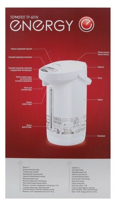 Чайник-термос Energy предназначен для кипячения воды и поддержания ее высокой температуры от сети переменного тока. Данная модель оснащена функцией быстрого кипячения воды, съемным шнуром питания, нержавеющей стальной колбой, скрытым нагревательным элементом, функцией поддержания температуры, поворотом корпуса на 360°, а также тремя способами подачи воды.