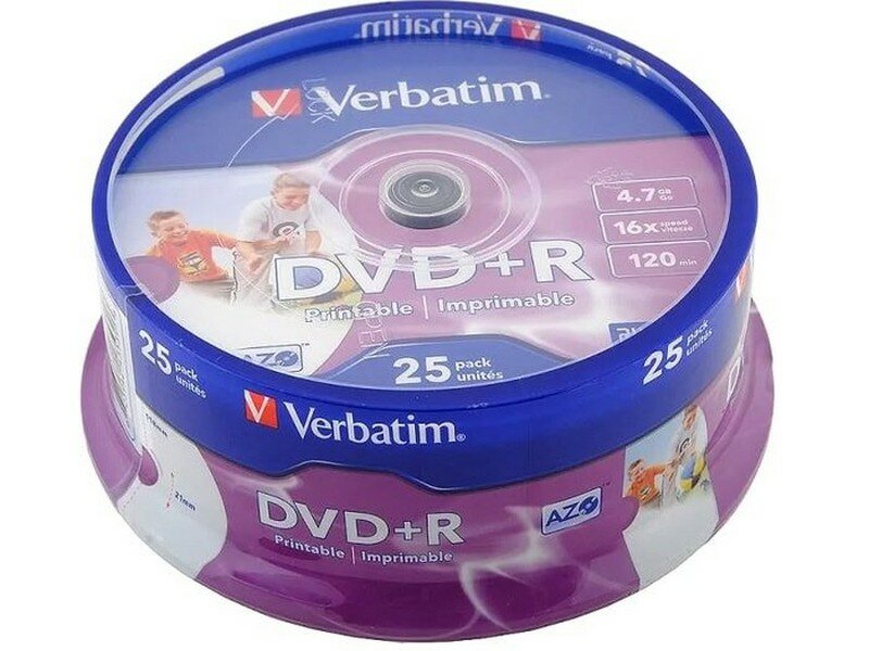 Традиционный накопитель данных, компакт диски, не утратил актуальности и сегодня. Комплект бренда Verbatim включает 25 изделий типа DVD+R с ёмкостью 4,7Гб. Допустимая для данного типа дисков скорость записи составляет 16х. На дисках нанесён дополнительный записывающий слой. Поставляется набор в cake box упаковке, габариты которой 140х140х50 мм, вес комплекта с упаковкой 0,48 кг.