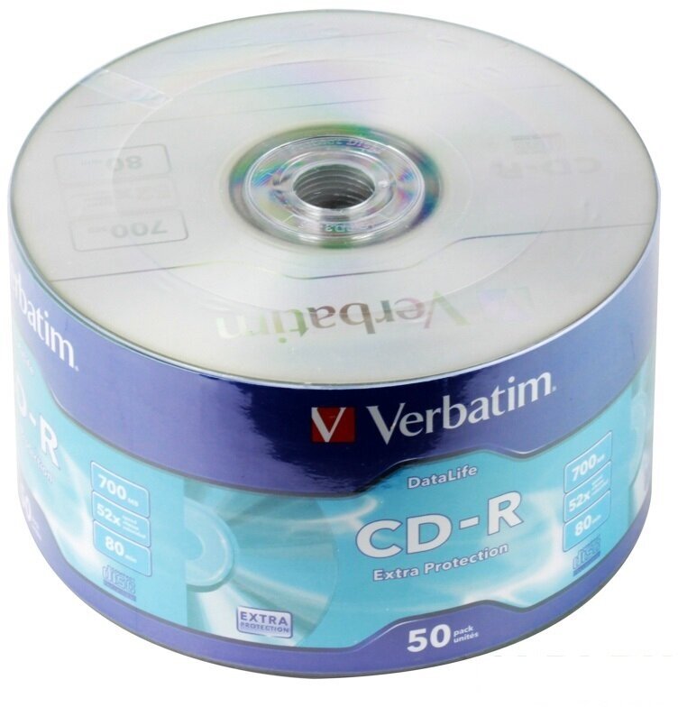 Оптические компакт-диски CD-R Verbatim 700Mb 52х являются надёжным накопителем для звуковых данных в цифровом формате. Данное устройство позволяет записать до 80 минут аудио данных с использованием скоростей записи до 52х. В данный комплект входят 50 дисков с поверхностью extra protection. Упаковка типа Cake Box имеет габариты 140х140х95 мм, вес дисков с упаковкой 0,85 кг.
