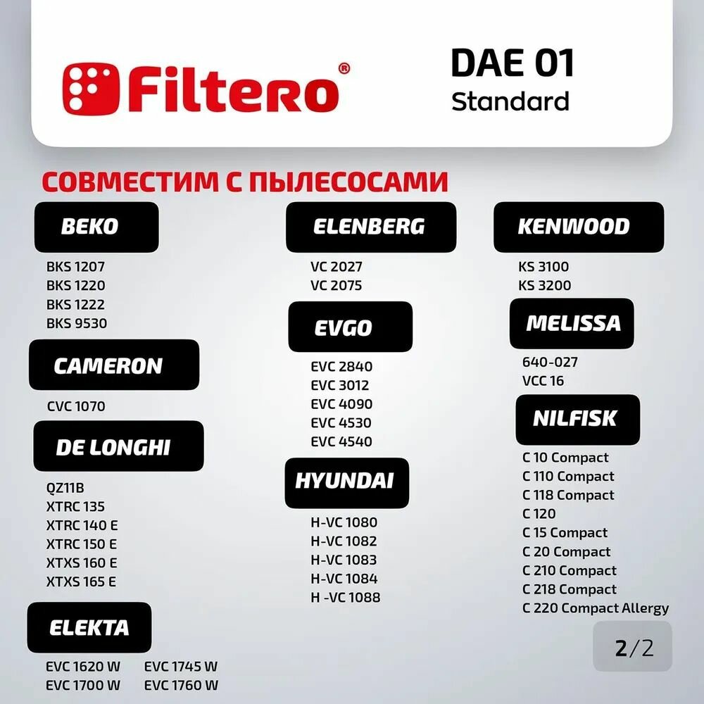 | Совместимые модели пылесосов | Akira, Alpina, Ariete, Beko, Cameron, Daewoo, Delonghi, Elekta, Elenberg, Evgo, Hyundai, Kenwood |