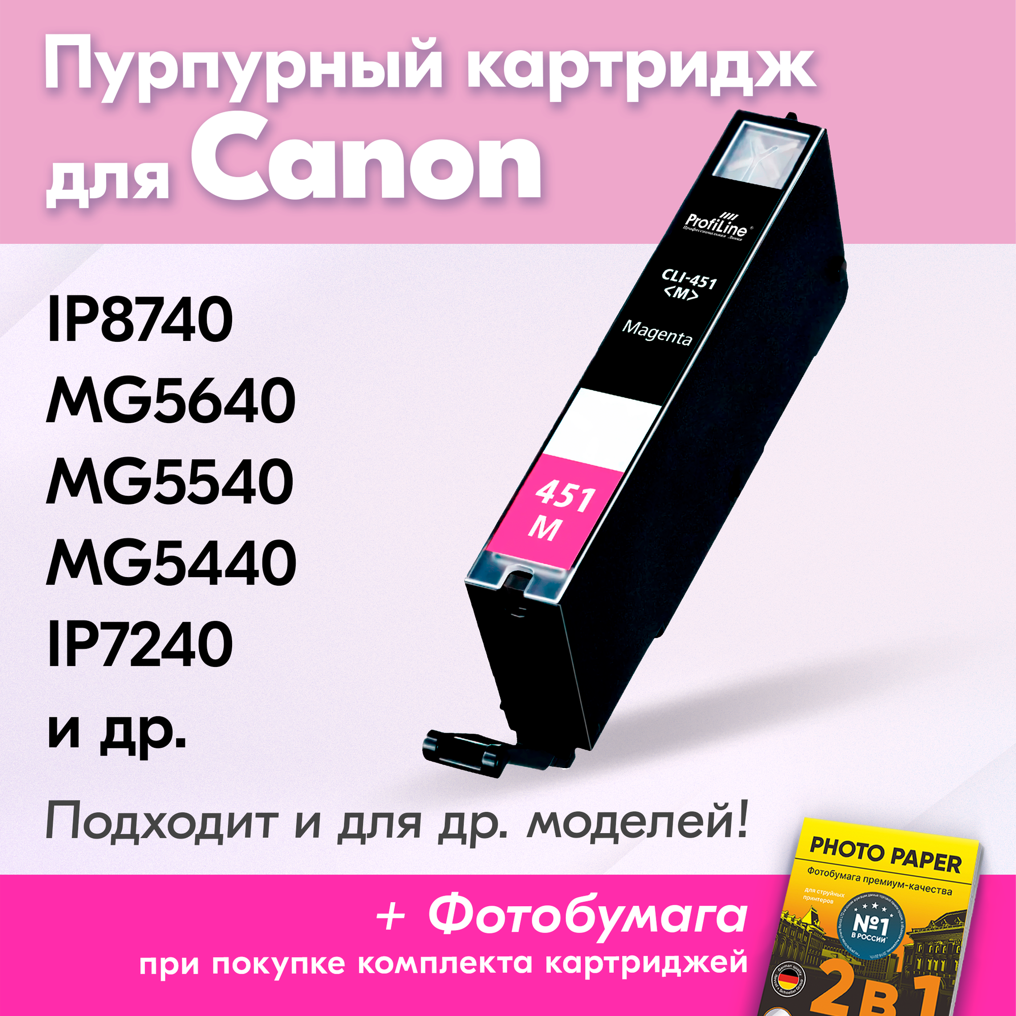 Струйный картридж Canon CLI-451M (XL) имеет пурпурный цвет и подходит для струйных принтеров компании Canon. Это оригинальный расходный материал, использование которого предотвращает поломки печатающих устройств, связанные с использованием некачественных элементов.