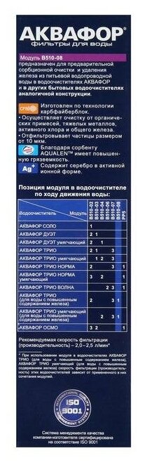 Модуль Аквафор предназначен для предварительной сорбционной очистки и удаление железа из питьевой водопроводной воды в водоочистителях Аквафор и в других бытовых водоочистителях аналогичной конструкции. Изготовлен по технологии карбфайберблок. Осуществляет очистку от органических примесей, тяжелых металлов. Отфильтровывает частицы размером до 10 мкм. Содержит серебро в активной ионной форме.