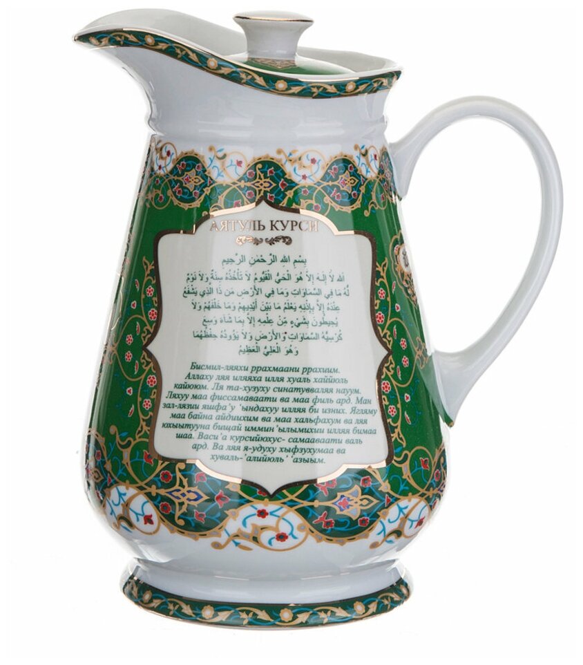Кувшин С крышкой сура аятуль курси/фатиха 1550 МЛ. ТМ LEFARD представляет эксклюзивную коллекцию посуды «Суры из Корана». Кувшины, чайники, сахарницы, кружки, чайные пары, декоративные тарелки и другие предметы выполнены из высококачественного тонкостенного фарфора. Восточный орнамент, небольшие отрывки Сур из Корана на классическом арабском и русском языках с отделкой золотом украшают изделия. Это прекрасный мусульманский подарок, всегда нужный и теплый. Относитесь к нему бережно и с почтением. Посуду коллекции можно использовать как в повседневной жизни, так и на торжественном приеме. Не рекомендуется мыть в посудомоечной машине и использовать в микроволновой печи. Материал: Фарфор Микроволновая печь: Нет Объем: 1500 мл Объем, л: 1.55 Посудомоечная машина: Нет Серия: Сура 1/8 Бренд: Lefard Страна: китай