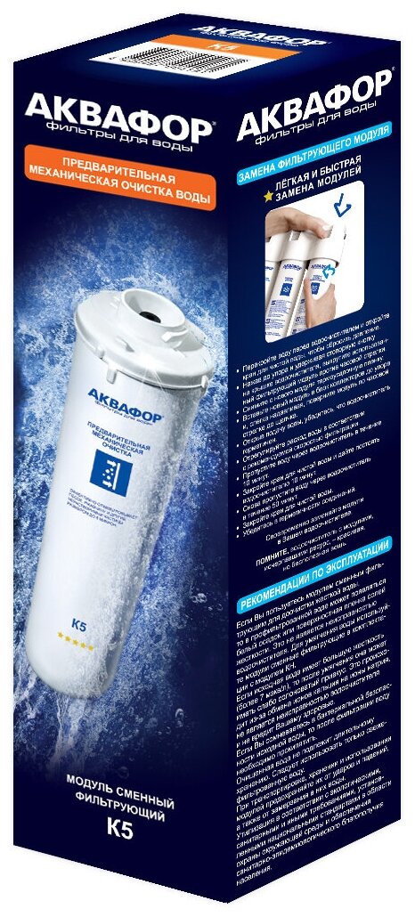 Сменный модуль Аквафор K5 создан для эффективной механической предочистки воды. Его рекомендуется использовать в системах Аквафор с отдельным краном. Модуль сочетает в себе только самые современные технологии, поэтому он с легкостью отфильтровывает песок, ржавчину и другие нерастворенные частицы размером до 5 микрон. Вода — это один из основных источников здоровья организма, поэтому очень важно правильно обрабатывать ее перед использованием.