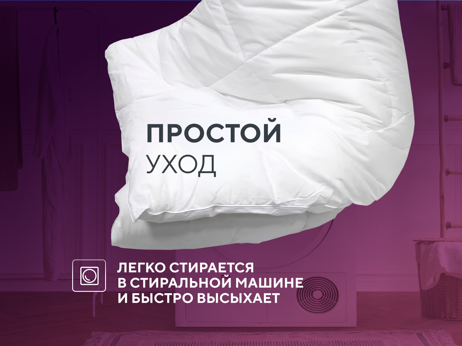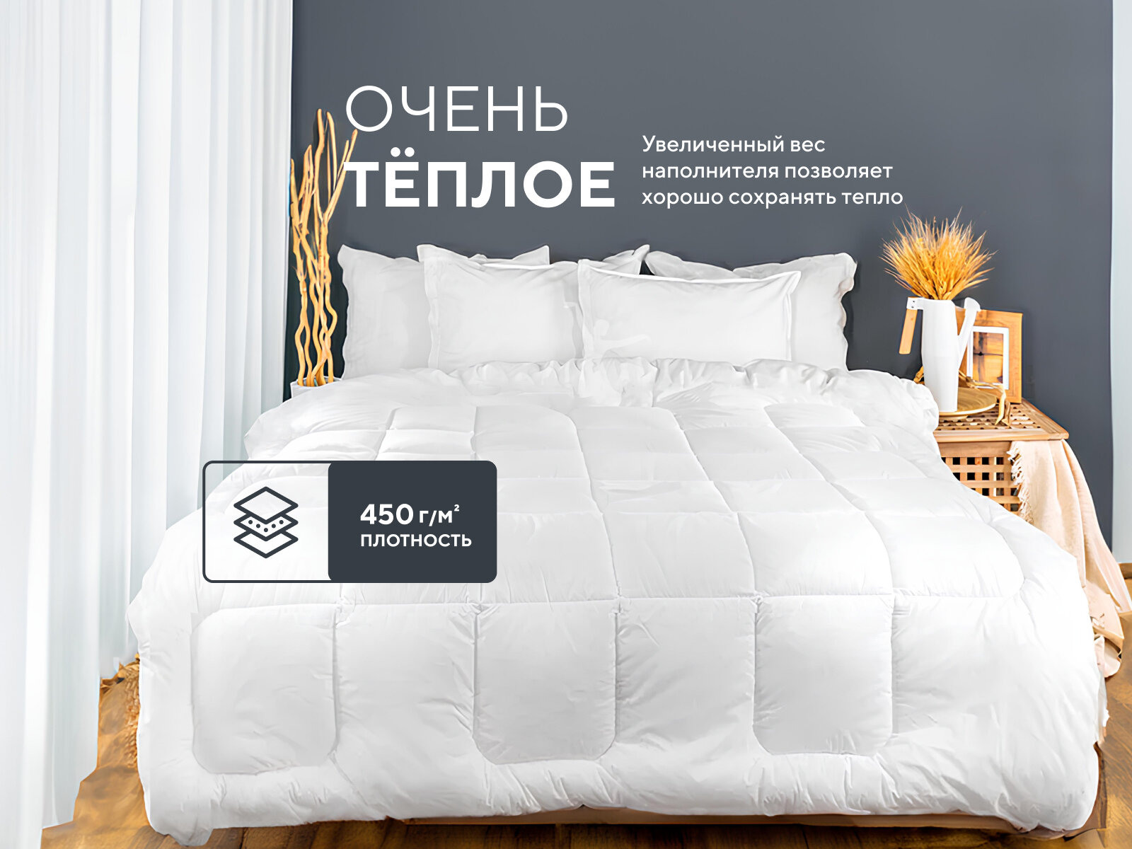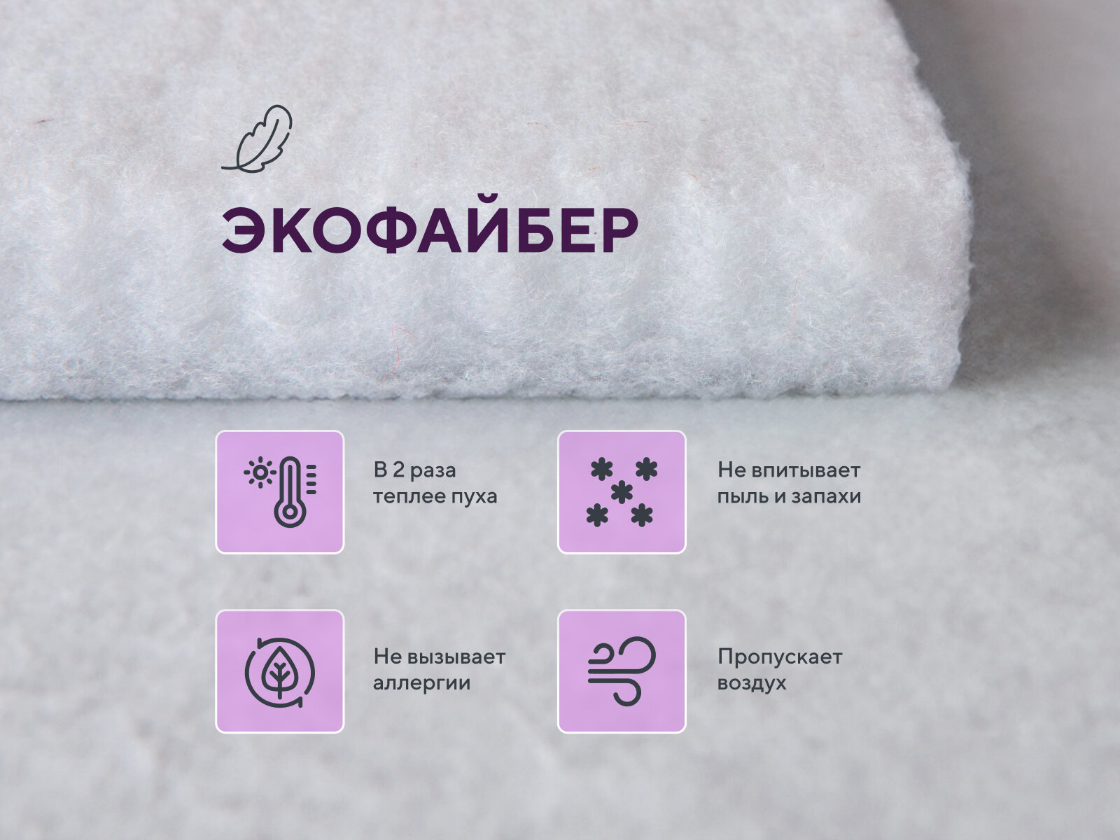 Модель выполнена из сатина — плотной ткани, которая хорошо пропускает воздух. Она не электризуется, поэтому не притягивает пыль. Наполнителем служит силиконизированное волокно. Оно обладает рядом преимуществ: