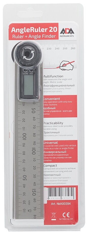| Дополнительно | Электронный угломер ADA AngleRuler 20 предназначен для измерения углов. ADA AngleRuler 20 имеет встроенный электронный датчик угла, показания с которого отображаются на встроенном ЖК цифровом дисплее. Рабочий диапазон:0°...360°. Металлические линейки. |