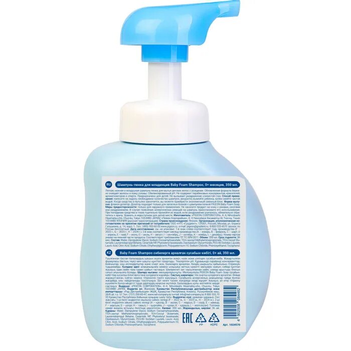 Шампунь-пенка Pigeon - деликатное средство, разработанное для очищения кожи головы и мягких волосиков малыша, а также корочек новорожденного. Сбалансированный состав при мытье удаляет только необходимое количество кожного жира, сохраняя естественную увлажненность кожи. Не щиплет глазки. Специальный дозатор вспенивает шампунь в густую мягкую пену, и позволяет пользоваться средством одной рукой, одновременно с этим, второй рукой можно держать малыша в ванной.