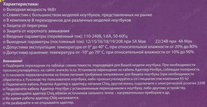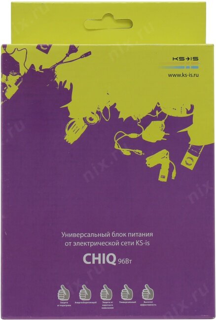 KS-is KS-257 Chiq - универсальный блок питания, который прекрасно подойдет пользователям для надежной стабильной работы в любое время суток и в любом месте. Рабочая мощность блока составляет 96 Вт. Напряжение устанавливается вручную переключателем, в зависимости от модели ноутбука. В комплекте поставляется 8 переходников для совместимости с ноутбуками различных производителей.