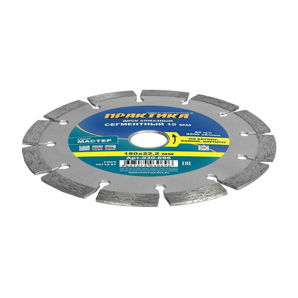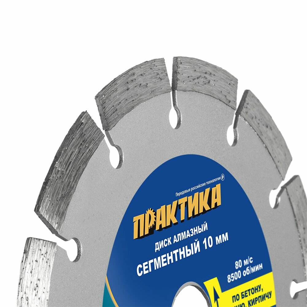 ПРАКТИКА - предназначен для резания бетона, армированного бетона, кирпича, общестроительных материалов, тротуарной плитки. Сухой рез. Для ручного электроинструмента. Высокая скорость реза и ресурс. Во время пиления для охлаждения диска, вынимайте диск из пропила каждые 30 секунд. Не заглубляйте диск более чем на 1 см за один проход.