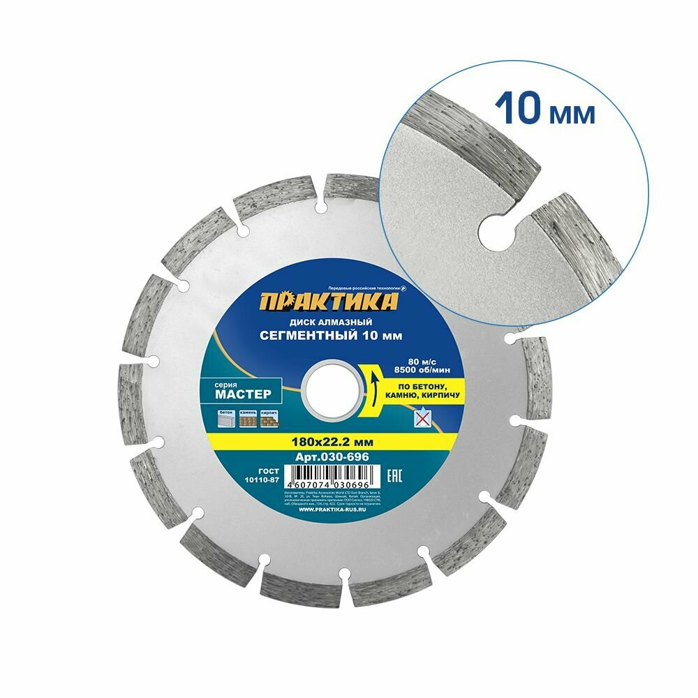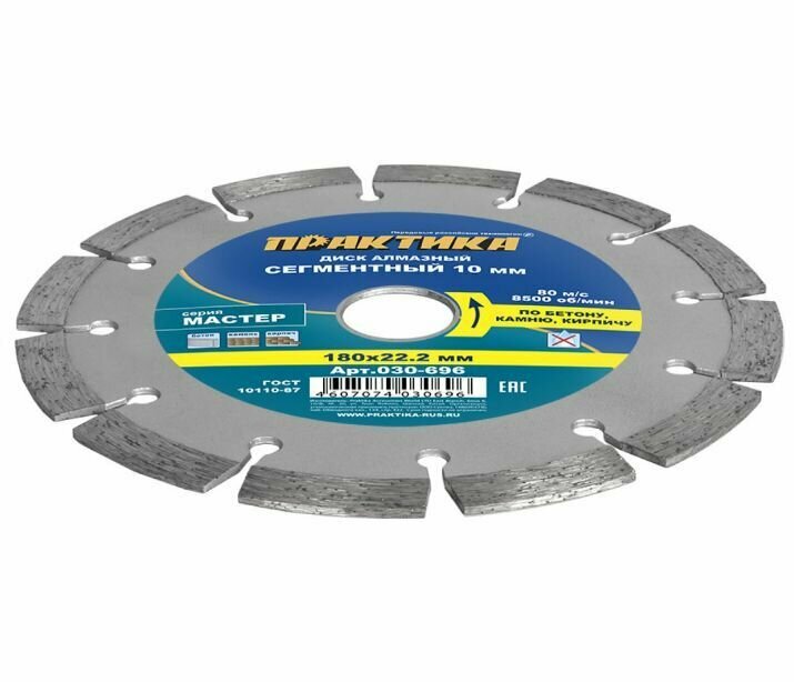 Серия «Мастер». Тип 1А1RSS. Сегмент 10 мм. ГОСТ 10110-87. Алмазные диски для широкого спектра строительных материалов: кирпич, бетон, искусственный и натуральный камень. Очень высокая скорость резания. Для ручного электроинструмента. Способны разрезать тонкую арматуру в бетоне. Не для абразивных материалов. Сухой рез. Охлаждение водой увеличивает ресурс диска.