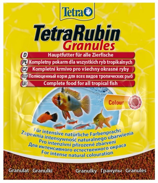 Корм в гранулах Tetra Rubin Granules предназначен для усиления насыщенности окраса тропических рыб. Он содержит все самые необходимые витамины и вещества для поддержания здоровья, окраски и жизненных сил ваших любимцев. Благодаря герметично-закрывающиеся крышке банки, корм надолго сохранит свою свежесть. Вес корма составляет 100 грамм.