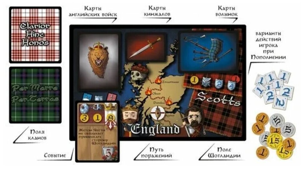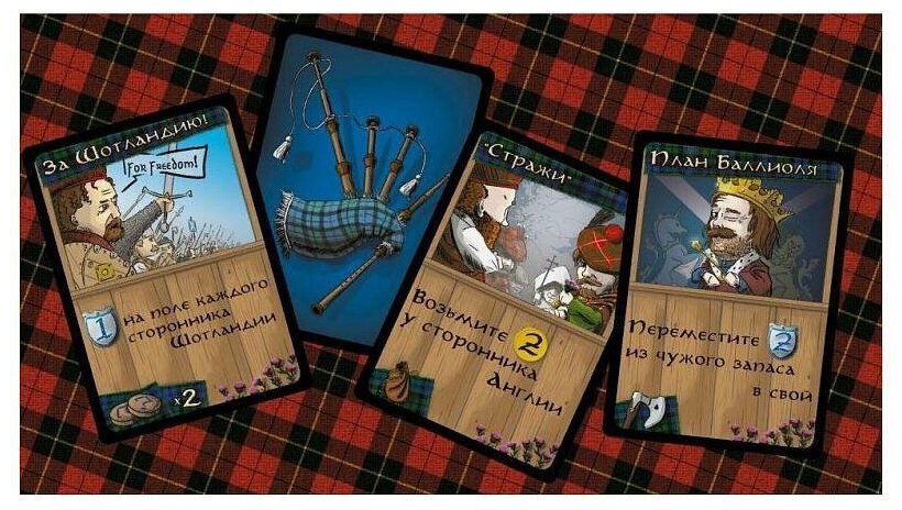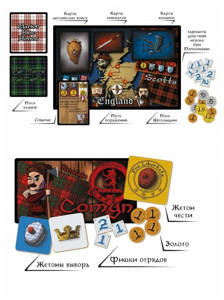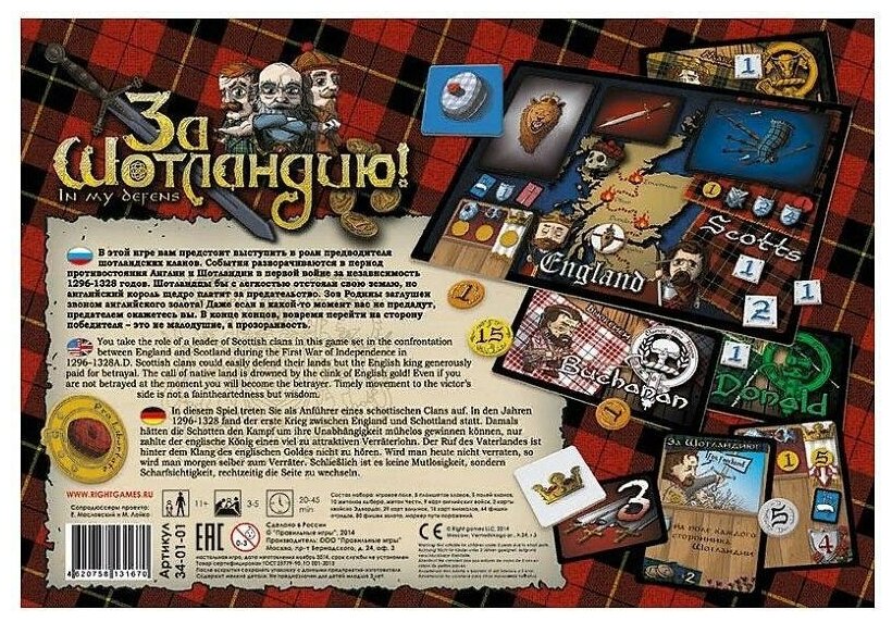Настольная игра За Шотландию! приглашает Вас вступить в доблестные ряды шотландской армии в борьбе за ее независимость. Каким солдатом Вы будете: верным или трусливым, покажет лишь время, поскольку бои будут не шуточными! Интриги и сплетни будут сбивать с истинного пути отваги и чести, лишь самый честный сможет противостоять соблазну поддержать численное превосходство армии английского короля. На чьей же стороне будет победа?