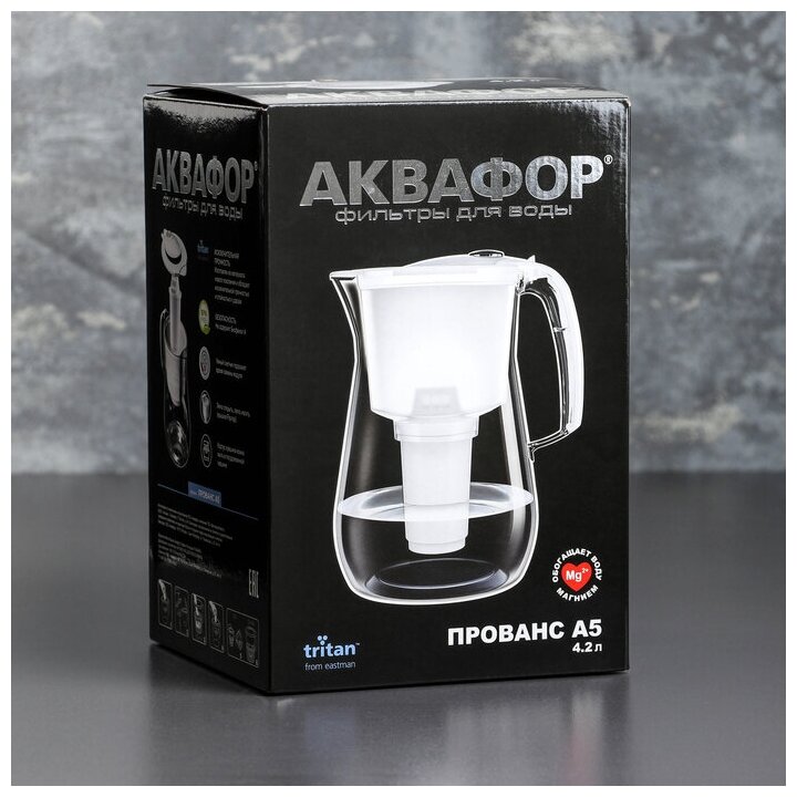 | Прочие особенности и свойства | АКВАФОР Прованс А5 выдувают как настоящий стеклянный кувшин, простая и благородная форма которого приятна глазу и гармонична в любом интерьере. Корпус Прованса сделан из небьющегося пластика – Eastman Tritan™. Этот современный материал выглядит как стекло, при этом он легкий и невероятно прочный. Кувшин надолго сохранит глянец даже при активном использовании и падениях.,,Особая конструкция сменного модуля АКВАФОР А5 увеличивает ресурс и позволяет дольше очищать воду от вредных примесей, посторонних привкусов и запахов, даже если она ржавая или мутная. Уже очищенная вода дополнительно обогащается солями магния. Отследить время замены поможет механический счетчик на крышке, который легко обнулить при замене фильтра.,,,Многофункциональная защита,Очистит воду от самых распространенных примесей, включая хлор, органические соединения, тяжелые металлы, ржавчину, фенолы, остатки лекарственных средств.,,Ресурс - 350 л,Объем кувшина - 4,2 л,Оптимизирует минеральный состав,Счётчик механический,Крышка откидная |
