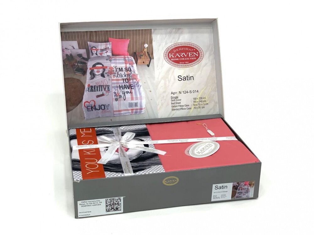 Представляем постельное белье ТМ Karven из Deluxe сатина с уникальной 3D печатью, которая невероятно четко и ярко передает рисунки и цвета. Плотность материала составляет 130 г/м², что делает достаточно износостойкой. Рекомендации по уходу: деликатная стирка при температуре не выше 30 градусов без отбеливающих средств, сушка в деликатном режиме, глажка белья слегка влажным при температуре не выше 150 градусов. Возможна сухая химчистка. Ткань: 3D сатин Deluxe (100% хлопок) Упаковка: красочная подарочная картонная коробка