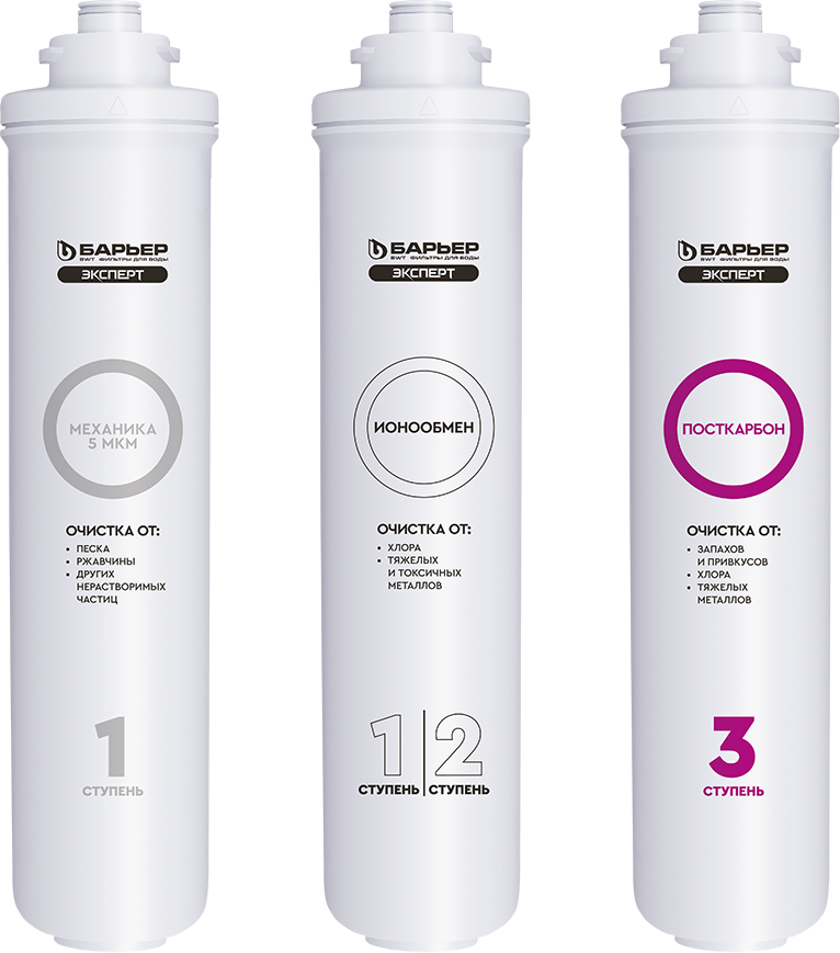 | Особенности | Максимальное рабочее давление - 7 атм Температура очищаемой воды - от 5°С до 40°С Фильтрующие картриджи: - EXPERT Механика - служит для фильтрации от механических загрязнений, с тонкостью фильтрации 5 мкм, таких как песок, взвеси, ржавчина, окалина и других типов - EXPERT Ионообмен - состоит из фильтрующей смеси, для высококачественной очистки от токсичных и тяжелых металлов - EXPERT ПостКарбон - служит для эффективной доочистки от железа, ионов тяжелых и токсичных металлов |