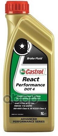 Castrol React Performance DOT 4 - высококипящая синтетическая тормозная жидкость, превосходящая требования спецификаций SAE J1704, FMVSS 116 DOT 3 и DOT 4, ISO 4925 и JIS K2233. Продукт изготовлен на основе смеси полиалкиленгликолевых эфиров и борсодержащих сложных эфиров с высокоэффективными присадками и ингибиторами, обеспечивающими превосходную защиту от коррозии и препятствует образованию паровых пробок при высокой температуре.