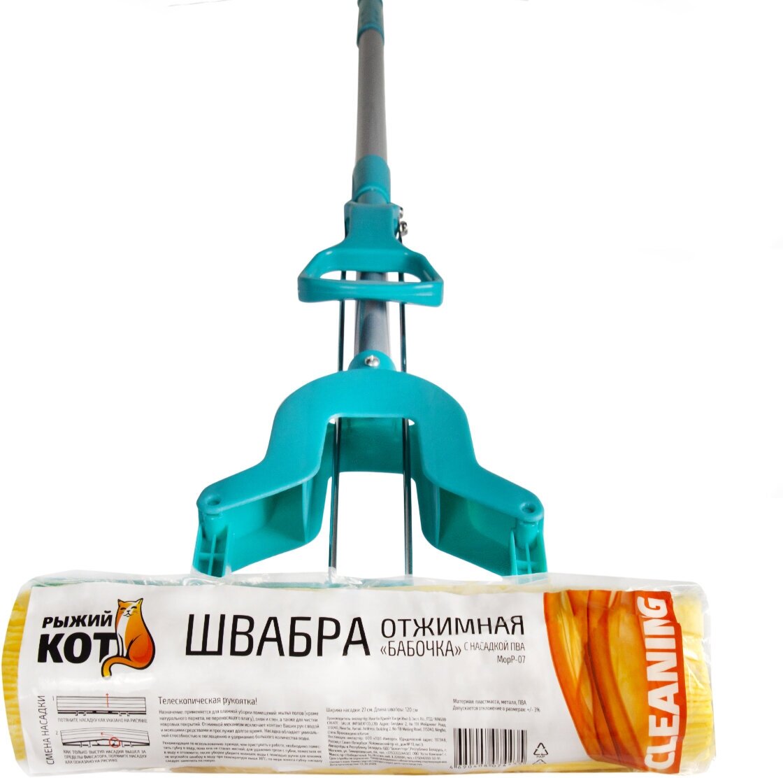 Швабра Рыжий кот, отжимная Бабочка, применяется для влажной уборки помещений: мытья полов, кроме натурального паркета, не переносящего влагу, окон, стен, для чистки ковров и ковровых покрытий. Алюминиевый отжимной механизм исключает контакт рук с водой и моющими средствами и прослужит долгое время. Насадка обладает уникальной способностью к поглощению и удержанию большого количества воды.