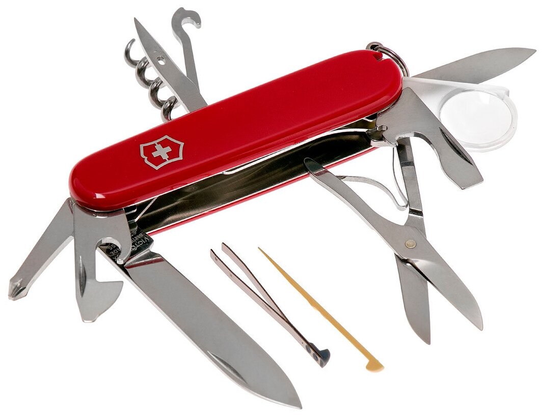 Классический многофункциональный швейцарский перочинный нож Victorinox Explorer имеет необходимые в повседневной жизни инструменты, такие как консервный нож, штопор, отвертка, ножницы, инструмент для снятия изоляции, лупу.