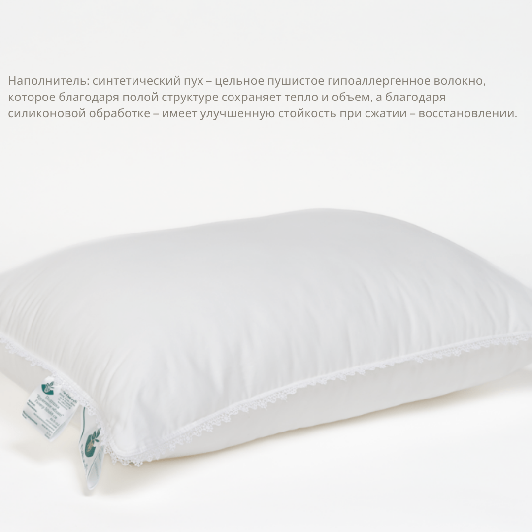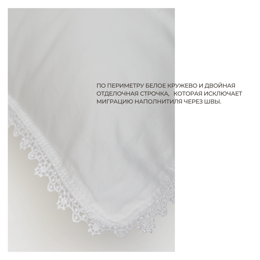 Подушка коллекции «Кружевное Облако» имеет очень плотную белую ткань (100% хлопок), это продиктовано технологической необходимостью, так как в качестве наполнителя здесь используется ультратонкое высокосиликонизированное микроволокно, обладающее эффектом «утопания». Такой чехол не позволит домашней пыли накапливаться в изделии и будет непреодолимым барьером для пылевых клещей. Подушка декорирована элегантным белым кружевом. Наполнитель: синтетический пух – цельное пушистое гипоаллергенное волокно, которое благодаря полой структуре сохраняет тепло и объем, а благодаря силиконовой обработке – имеет улучшенную стойкость при сжатии – восстановлении. Технология пошива подушки: Классическая конструкция, по периметру белое кружево и двойная отделочная строчка, которая исключает миграцию наполнителя через швы. Ткань чехла: 100% хлопок — мерсеризованный кардный сатин из средневолокнистого хлопка. Плотность: 206/112 нитей на 10 см²,120 г/м². Цвет белый. Рекомендации по уходу: число стирок не ограничено! Стирать каждое изделие отдельно при температуре 60⁰, отжим на высоких оборотах барабана, сушить в расправленном виде. Не выкручивать при отжиме. Регулярно встряхивать и взбивать изделия после проведенной на них ночи. Наполнитель: Ультратонкое высокосиликонизированное микроволокно (100% п/э)Ткань: 100% хлопок, цвет белый, отделка белым кружевом