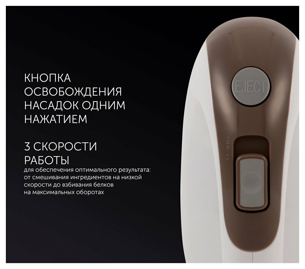 Часто пеку блинчики, кексы, торты, оладушки. Надоело взбивать вручную, приобрела этот миксер. Комплектация самая простая, только два вида насадок, но зато самые нужные. Взбивает хорошо, три режима скорости, пользуюсь в основном первыми двумя. Вот только шнур, пожалуй, можно было бы и подлинней сделать.