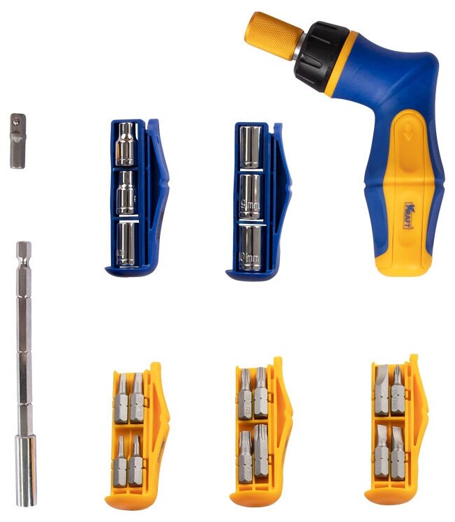 Садовый инструмент Kraft KT 700449 Набор Kraft KT 700449 состоит из 41 предмета и включает в себя реверсивную Г-образную отверточную рукоятку с комплектом бит и торцевых головок. Она изготовлена из хром-ванадиевой стали и имеет двухкомпонентную ручку с прорезиненной накладкой для удобства ипользования. Биты и торцевые головки закреплены в специальных обоймах, которые можно вставлять в ручку и всегда держать под рукой.
