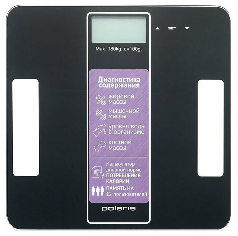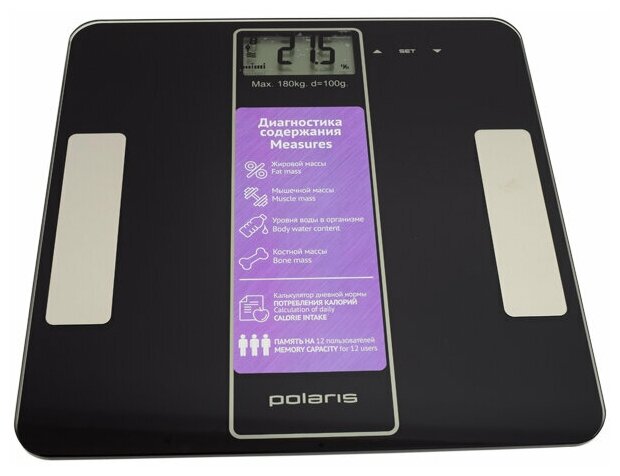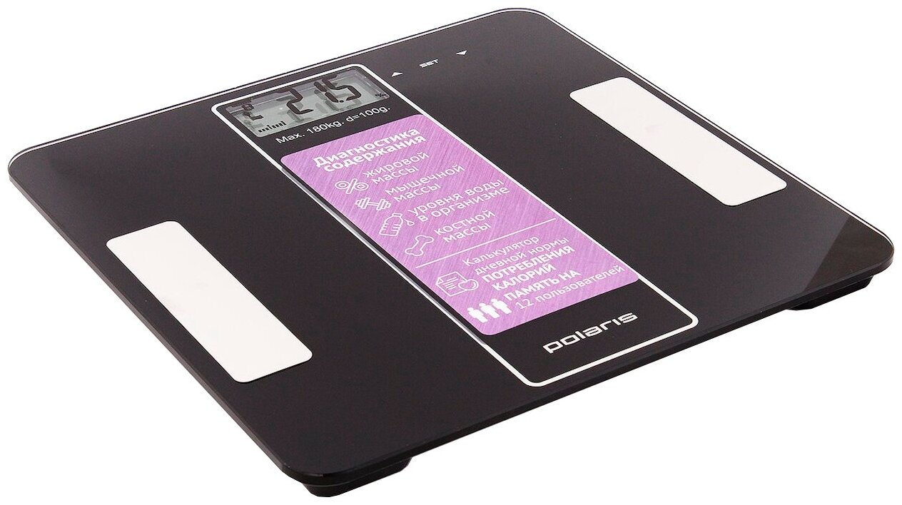 Диагностические напольные весы Polaris с высокой точностью измерения станут неизменным спутником для людей, следящих за своим весом. Прибор помимо массы тела позволяет измерять содержание воды в организме, процентное соотношение жировой, мышечной и костной массы, а также рассчитывать дневную норму потребления калорий. Весы имеют ячейки памяти на 12 пользователей, которые можно использовать для сохранения и вызова личных настроек всех членов семьи. Платформа выполнена из высокопрочного стекла, а прорезиненные ножки обеспечивают весам дополнительную устойчивость и предотвращают их скольжение по полу, что гарантирует безопасность во время взвешивания.