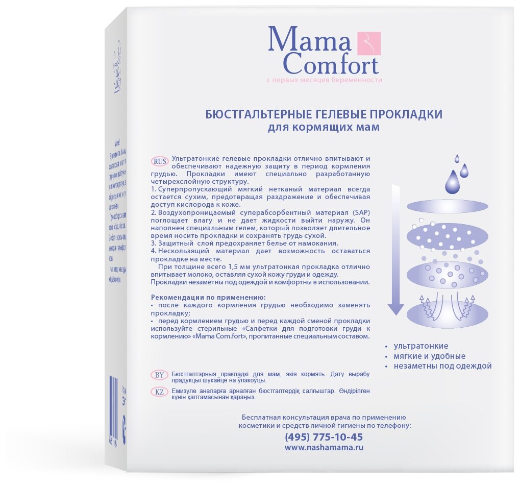 Вкладыши для бюстгальтера Mama Comfort - необходимое средство гигиены современной мамочки. Мягкий материал изделий заботится о здоровье кожи, именно поэтому он пропускает воздух и не вызывает раздражений. Специальный водонепроницаемый слой с гелем поглощает влагу и предотвращает протекание, а нескользящая поверхность позволяет надежно зафиксировать вкладыш под бельем.