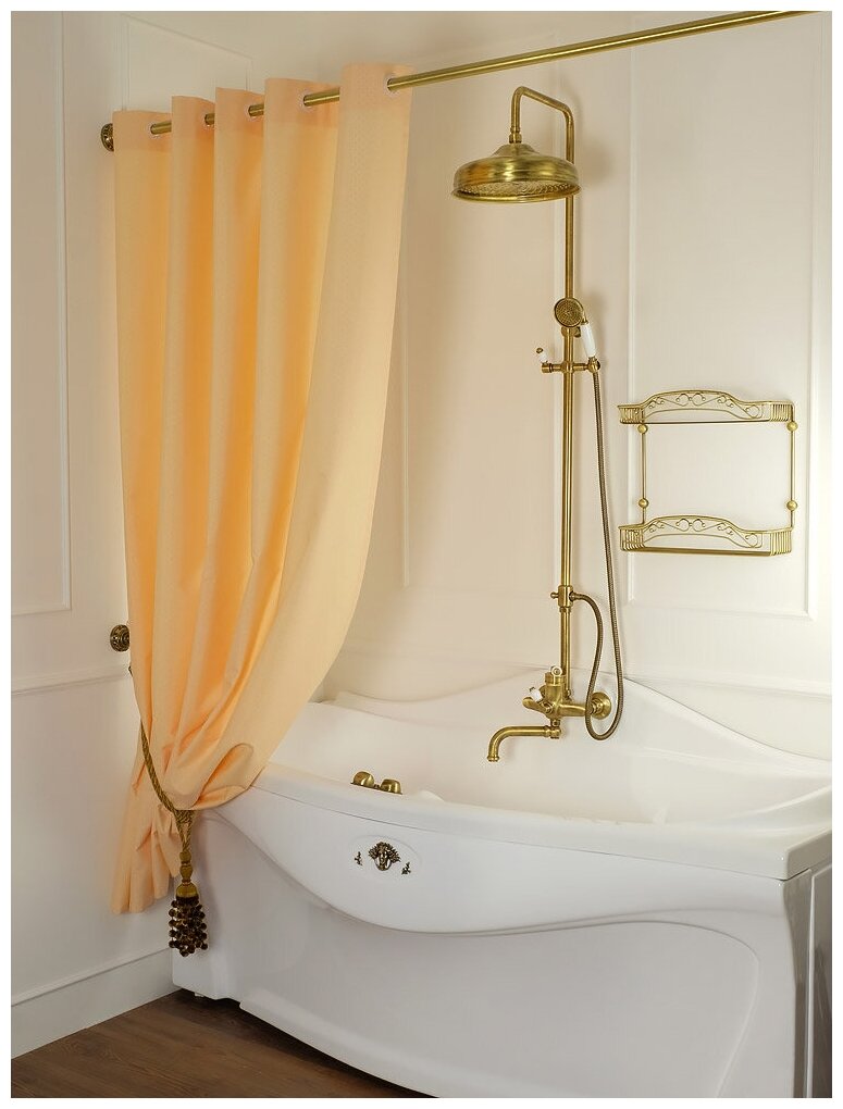 MIGLIORE Шторка L180xH200 см. для душа/ванны, текстиль, узор АР-ДЕКО, цвет бисквит Элегантная шторка изготовлена из сочетания полиэстера 55 % и хлопка 45% . Такой аксессуар создаст красивый, стильный и уютный интерьер в ванной комнате . Изготовлена с водоотталкивающей пропиткой и антибактериальной обработкой. Шторка либо просто нанизывается на карниз, либо крепится при помощи 10 крючков , которые в комплект не входят. Размеры шторки: ширина 180 см, высота 200 см.