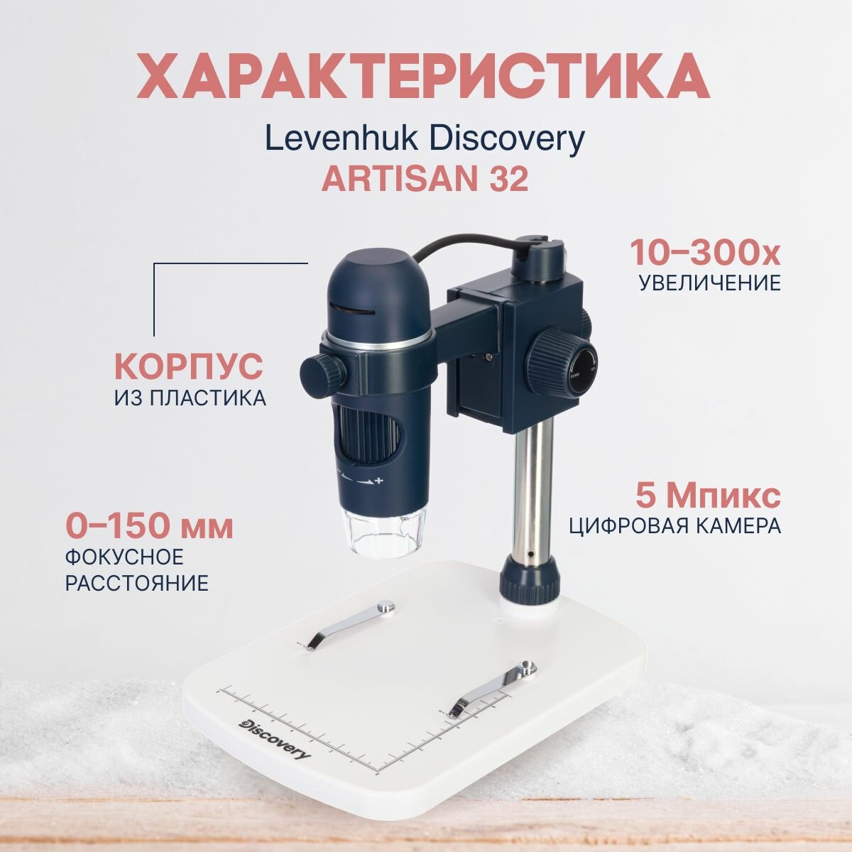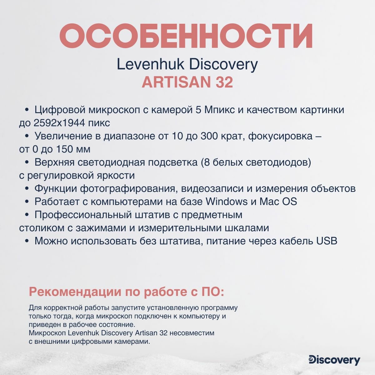 Discovery Artisan 32 – это цифровой USB-микроскоп с профессиональным штативом. Прибор прекрасно подойдет для выполнения профессиональных задач нумизмата, мастера сервисного центра, ювелира, часового мастера, реставратора, также его можно использовать для разных хобби. Для вывода изображения на внешний экран микроскоп следует подключать к компьютеру через разъем USB, также потребуется установка специальной программы (в комплекте). Микроскоп позволяет фотографировать и записывать видео, выполнять линейные и угловые измерения, рассчитывать диаметр, радиус и проч. Внутри установлена 5-мегапиксельная камера, вокруг объектива которой расположены 8 белых светодиодов. При слабом внешнем освещении рекомендуется использовать подсветку, ее яркость можно регулировать. Рассматривать образцы можно на увеличении от 100 до 300 крат – это очень хороший диапазон для микроскопа для прикладных работ. Фокусное расстояние выбирается вручную, настройка возможна в пределах от-до 150 мм. Максимальное разрешение изображения, которое создает микроскоп, составляет 2592x1944 пикс. Микроскоп установлен на штатив, но может использоваться и без него. Основание штатива представляет собой предметный столик с двумя металлическими зажимами и измерительными шкалами. Корпус прибора покрыт нескользящей и приятной на ощупь резиной, которая делает хват более надежным и защищает от мелких царапин. Микроскоп Discovery Artisan 32 – прекрасный профессиональный инструмент и хороший помощник в хобби, так как он прост в управлении и имеет множество полезных функции. Совместим с компьютерами с операционными системами Windows и Mac OS. Питание – через кабель USB. Основные особенности: Цифровой микроскоп с камерой 5 Мпикс и качеством картинки до 2592x1944 пикс Увеличение в диапазоне от 10 до 300 крат, фокусировка – от-до 150 мм Верхняя светодиодная подсветка (8 белых светодиодов) с регулировкой яркости Функции фотографирования, видеозаписи и измерения объектов Работает с компьютерами на базе Windows и Mac OS Профессиональный штатив с предметным столиком с зажимами и измерительными шкалами Можно использовать без штатива, питание через кабель USB Комплектация: Микроскоп Discovery Artisan 32 с USB-кабелем Профессиональный штатив Основание с измерительной шкалой Шкала калибровки Компакт-диск с программным обеспечением Инструкция по эксплуатации и гарантийный талон Рекомендации по работе с ПО: для корректной работы запустите установленную программу только тогда, когда микроскоп подключен к компьютеру и приведен в рабочее состояние. Микроскоп Discovery Artisan 32 несовместим с внешними цифровыми камерами.