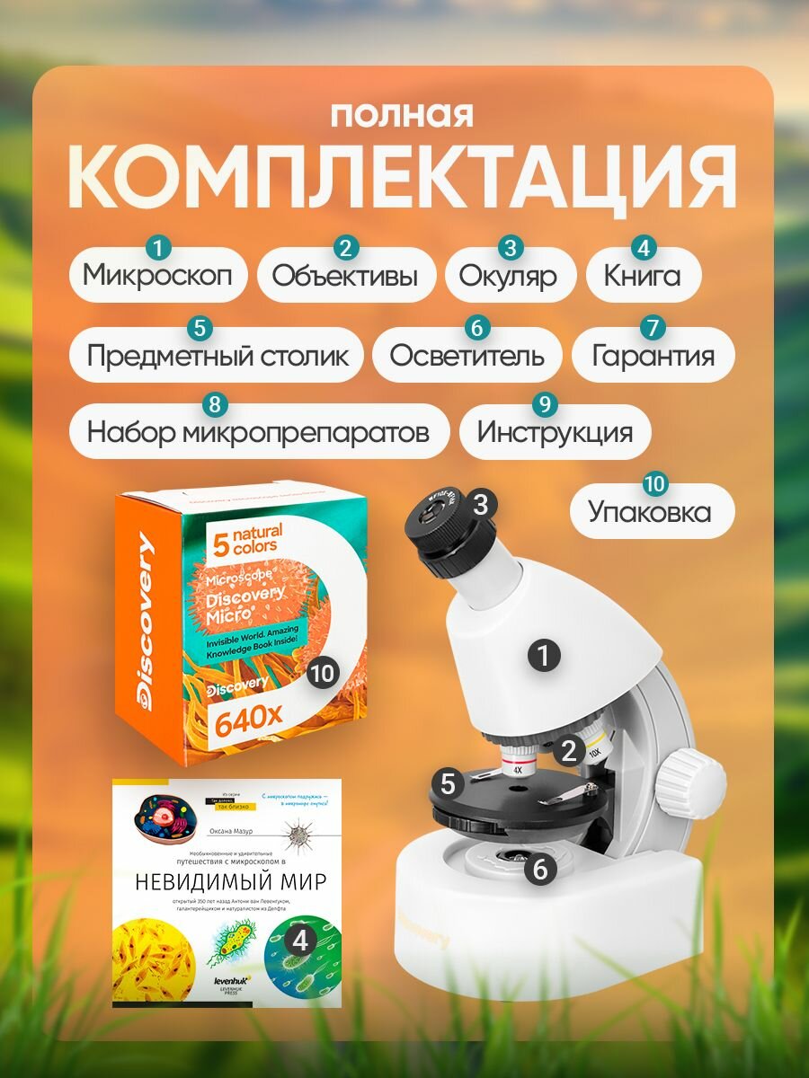 Микроскоп комплектуется познавательной книгой «Невидимый мир». Она посвящена микроскопии и рассказывает о том, что такое микроскопы, какие крошечные организмы живут вокруг нас и как их можно увидеть при помощи современной оптической техники. Язык книги несложный, приведены интересные опыты и занимательные факты. На станицах присутствует много красочных иллюстраций и фотографий.