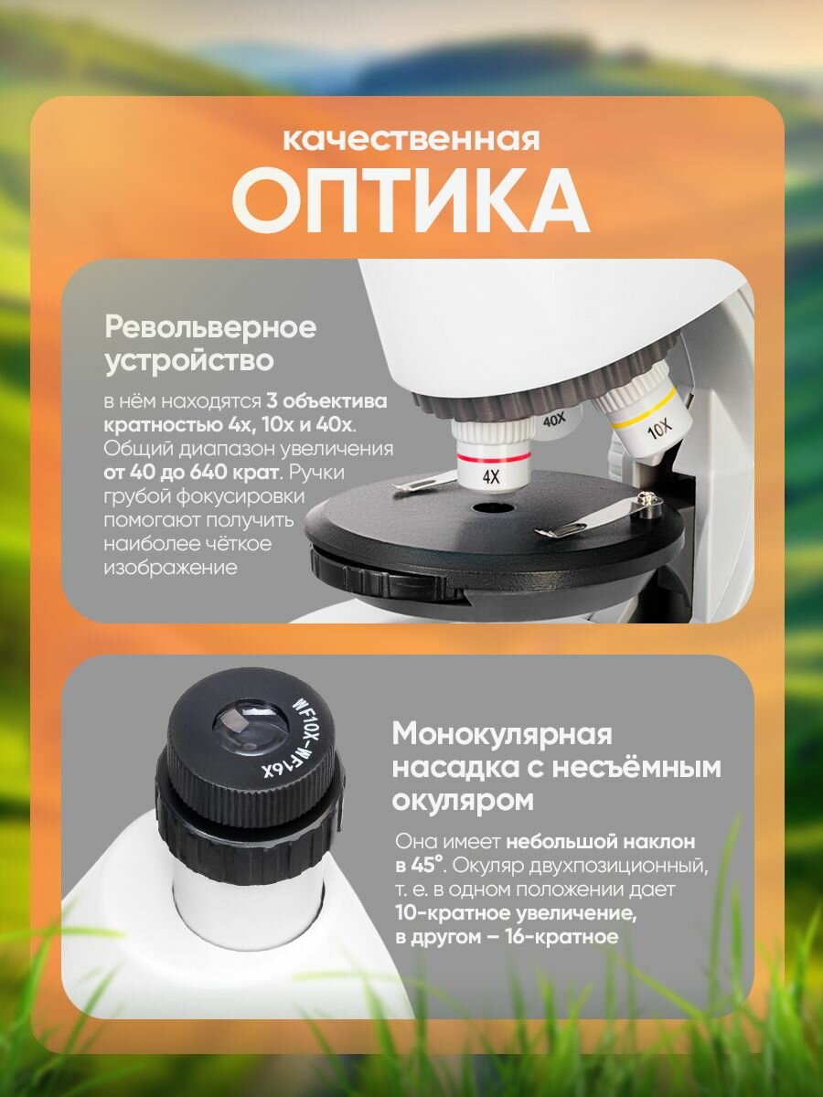 Микроскоп дает увеличение в диапазоне от 40 до 640 крат и позволяет рассматривать многие прозрачные образцы, в том числе крошечные водные организмы. А вот бактерии увидеть не получится – для этого нужна более мощная оптика. Револьверное устройство вмещает объективы разной кратности: 4х, 10х и 40х. Окуляр двухпозиционный, т. е. в одном положении он дает увеличение 10х, в другом – 16х. Так как он несъемный, его невозможно потерять. Резкость настраивается вручную при помощи боковых ручек грубой фокусировки. Окулярная трубка имеет удобный для длительных наблюдений наклон 45°.