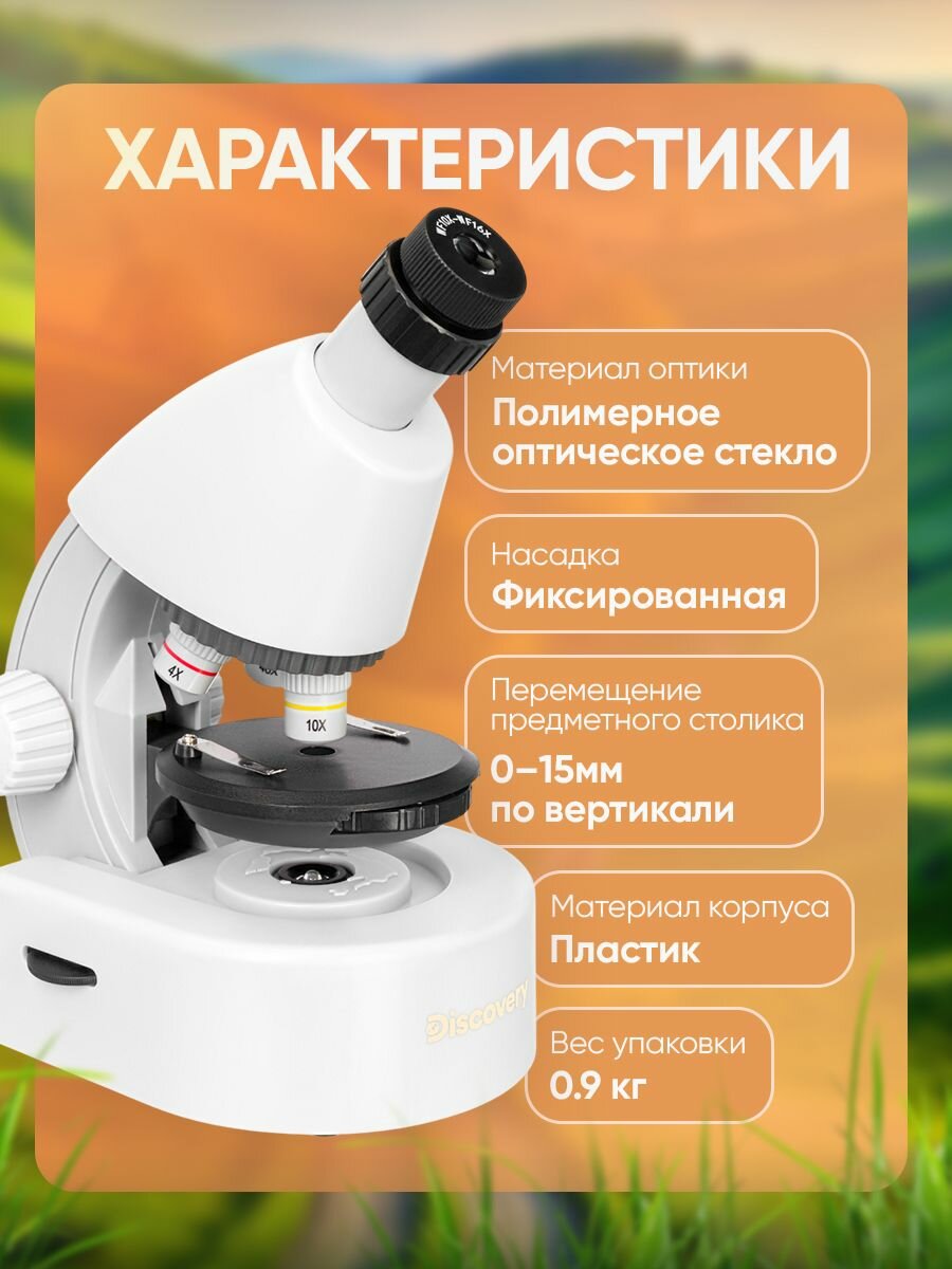 С микроскопом Discovery Micro Polar можно получить представление о том, как устроен микромир и как выглядят его обитатели. Возможностей оптики хватит, чтобы показать исследователю клеточное строение растительных и животных тканей, мелкие элементы конечностей и крыльев насекомых и многое другое. Лучше всего использовать с этим микроскопом готовые микропрепараты из наборов – они подходят к нему идеально. Микроскоп станет прекрасным выбором для начинающего пользователя, который ранее не имел опыта использования оптической техники.