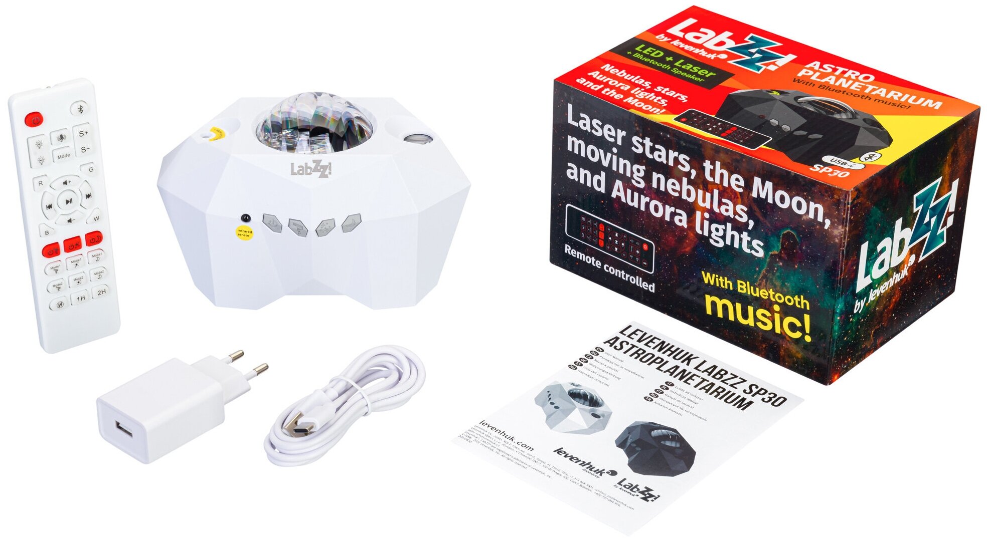 Астропланетарий Levenhuk LabZZ SP30 White стильный многофункциональный прибор, который понравится как детям и подросткам, так и взрослым. Включив проектор, вы сможете любоваться красотами космоса и северным сиянием на потолке или стене комнаты. Более того: астропланетарий позволяет прослушивать музыку и поддерживает голосовое управление, то есть выполняет функции умной колонки. А благодаря современному дизайну стильного многогранного корпуса прибор станет отличным подарком для любителей оригинальных гаджетов для дома и хай-тека в интерьере. Он создаст успокаивающую атмосферу в спальне перед сном, пригодится на детском празднике или тематической вечеринке.Для настройки и выбора режима используются кнопки на передней панели планетария. Кроме того, доступны два удобных способа дистанционного управления: с помощью пульта и голосовое. Используя пульт, необходимо направлять его на инфракрасный сенсор прибора, который находится слева от кнопок управления. Переключайтесь между проекциями, не вставая с дивана: доступны звезды, Луна и полярное сияние (с регулировкой скорости движения). Яркость проекций тоже можно регулировать. Чтобы насладиться видами космоса во всей красе, рекомендуется выключать свет и плотно задергивать шторы. Идеальное расстояние от проектора до стены или потолка 1,52 метра.Levenhuk LabZZ SP30 White интересен своим мультимедийным функционалом. Его можно использовать для воспроизведения музыки с мобильного телефона для этого требуется подключение по Bluetooth. Выбирать композиции и регулировать громкость тоже можно дистанционно.Основные особенности: Захватывающие космические виды и полярное сияние в музыкальном сопровождении Светодиоды, лазерная проекция, динамик с подключением по Bluetooth Функция таймера, автоматическое отключение через 4 часа бездействия Дистанционное управление с помощью пульта или голосом Последние сохраненные настройки запоминаются при отключении питанияКомплектация: Астропланетарий USB-кабель (тип C) Пульт дистанционного управления Сетевой адаптер Инструкция по эксплуатации и гарантийный талон