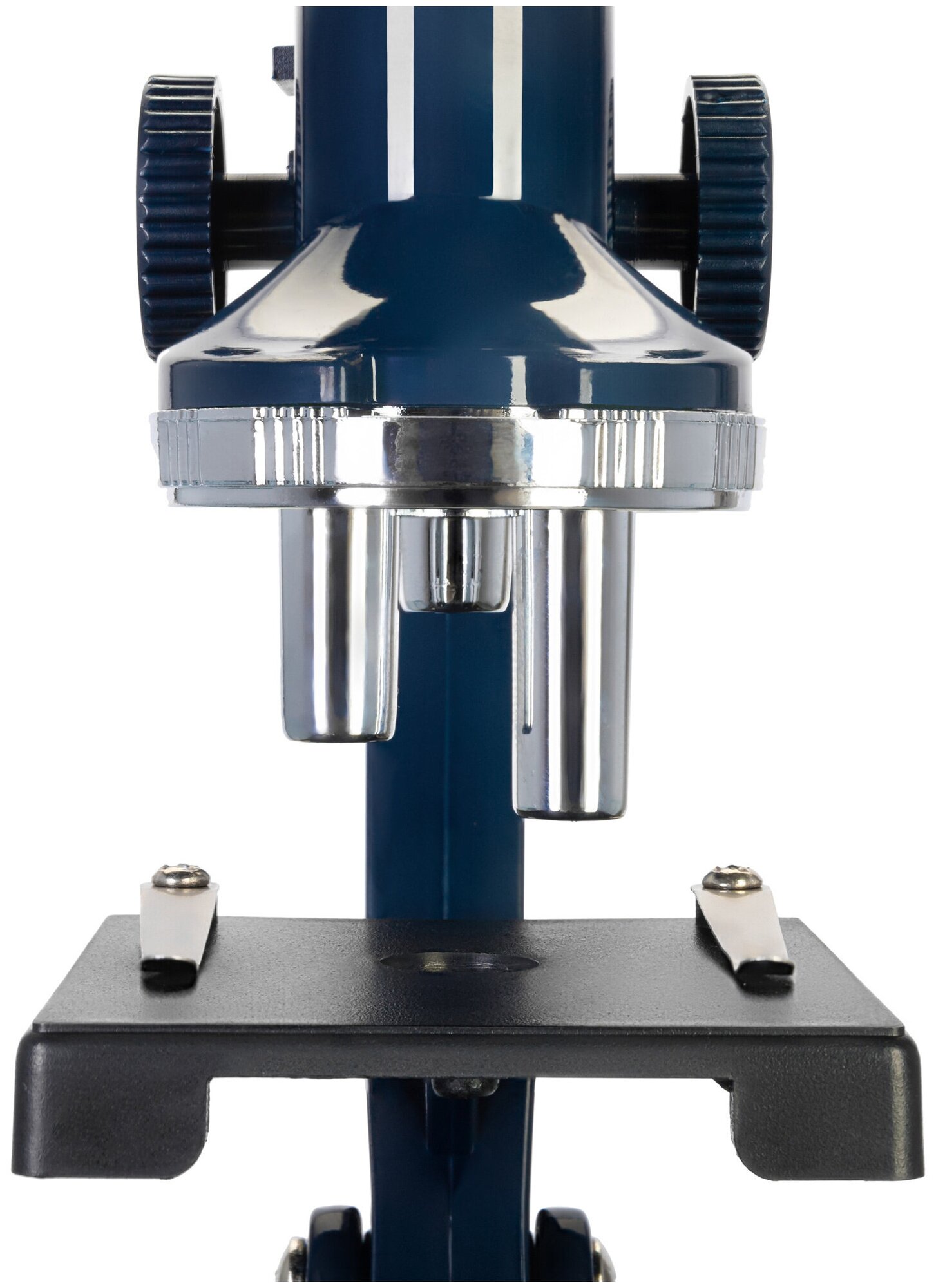 Микроскоп имеет монокулярную насадку и револьверное устройство на 3 объектива. Увеличение можно изменять в диапазоне от 100 до 900 крат. Чтобы изучить микропрепарат, его следует поместить на предметный столик и зафиксировать зажимами. Под предметным столиком есть диск с диафрагмами, который позволяет более точно настраивать освещение рабочей области. Источник освещения – сдвоенная подсветка. С одной ее стороны находится зеркало, с другой – лампочка накаливания. Благодаря этому при наблюдениях можно использовать как естественный, так и искусственный свет.