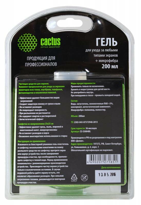 | Особенности | гель 200 мл + салфетка из микрофибры для экранов 200x230 мм |