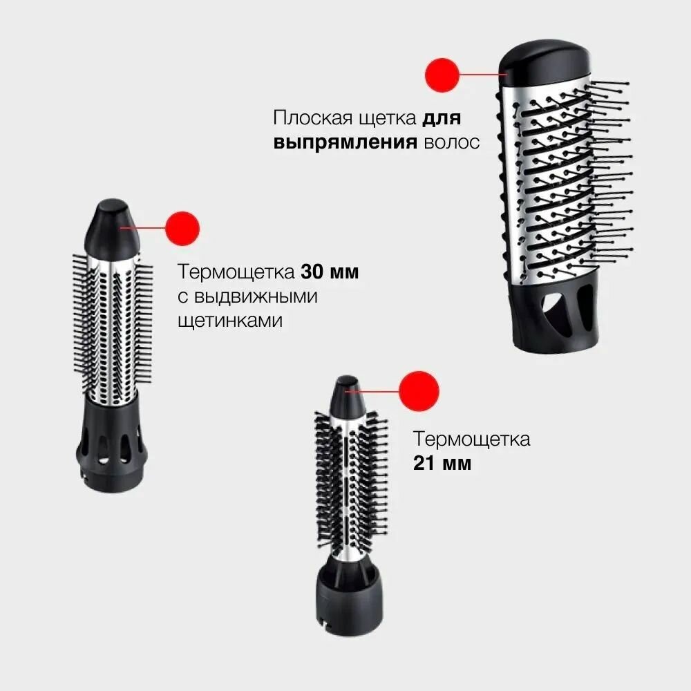 | Описание комплектации | Фен-щетка Плоская щетка для создания идеально прямых волос Термощетка 21 мм поможет в создании мягких волн Термощетка с выдвижными щетинками для создания более упругих кудрей Насадка для прикорневого объема Концентратор для сушки волос Сумка для хранения Инструкция по эксплуатации |