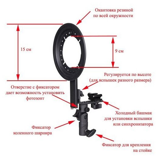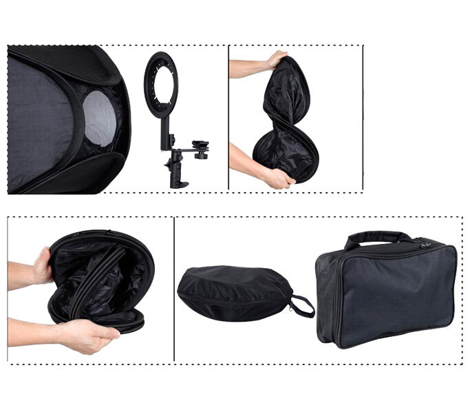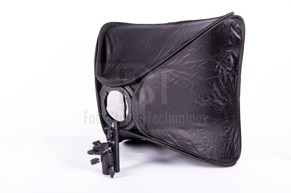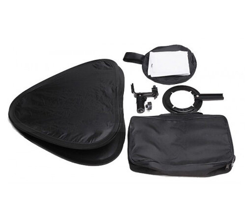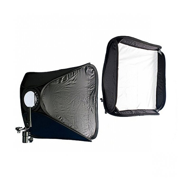 Быстроразборный софтбокс для камерных вспышек размер 40x40 см. Оснащен металлическим кронштейном и может быть установлен на любую вспышку с горячим башмаком.Кронштейн позволяет регулировать софтбокс по высоте относительно точки крепления вспышки. Софтбокс устанавливается на стойку с помощью стандартного крепления, оборудованного шаровой головой.