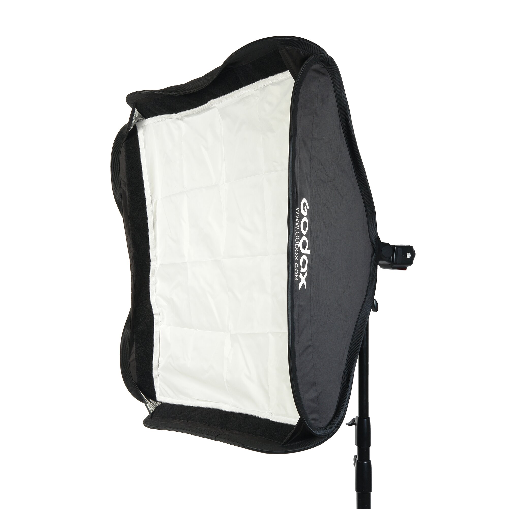 Из-за своих размеров данный софтбокс не может использоваться непосредственно на камере: вы можете удерживать его одной рукой на небольшом выносе (рекомендуем докупить более комфортную рукоятку) или поставить вместе со вспышкой на студийную стойку.