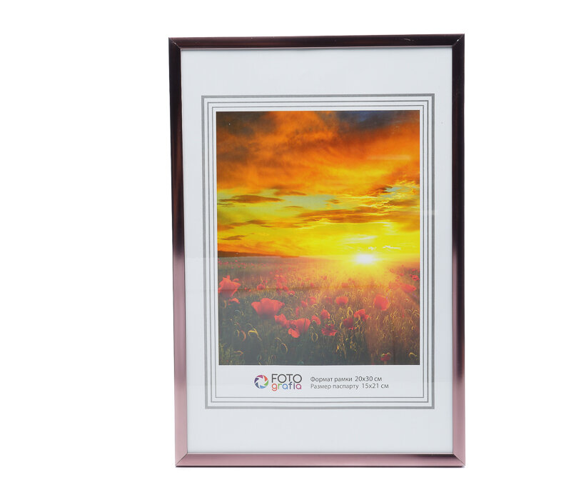 Рамка для фотографий формата 20х30 см или 15х21 см (с паспарту). Багет выполнен из тонкого алюминиевого профиля шириной 14 мм и толщиной 9 мм. Стекло минеральное, прочное (толщина 1.5 мм). Задник из плотного листа оргалита, предусмотрена ножка для размещения рамки на столе или полке, а также прорезь в зажимных креплениях для подвеса на крючок или гвоздик. Рамку можно размещать как вертикально, так и горизонтально.