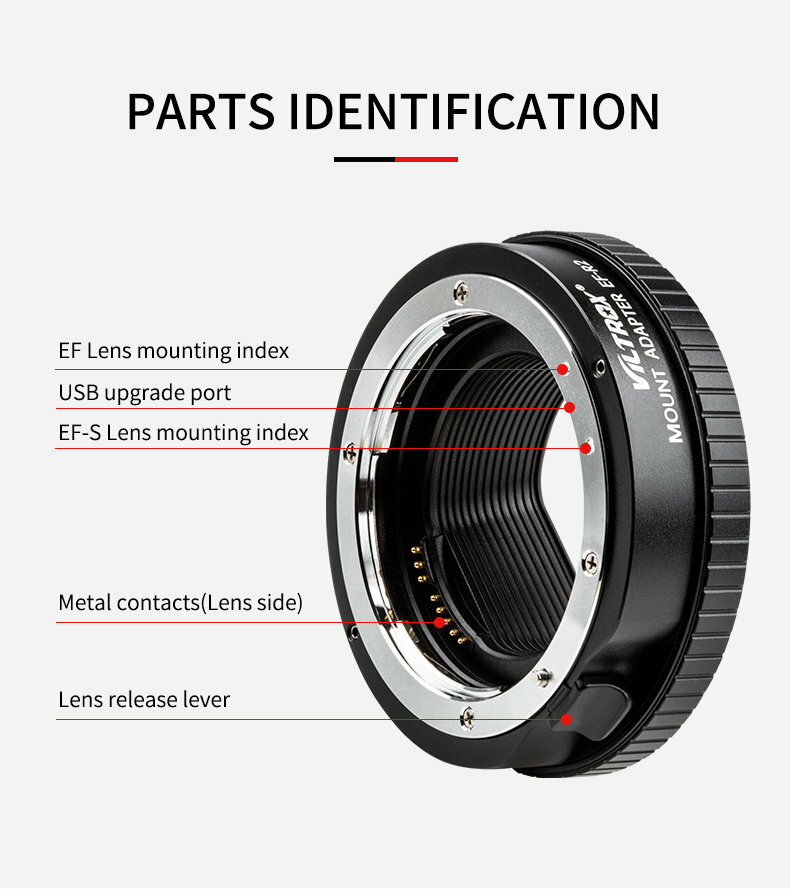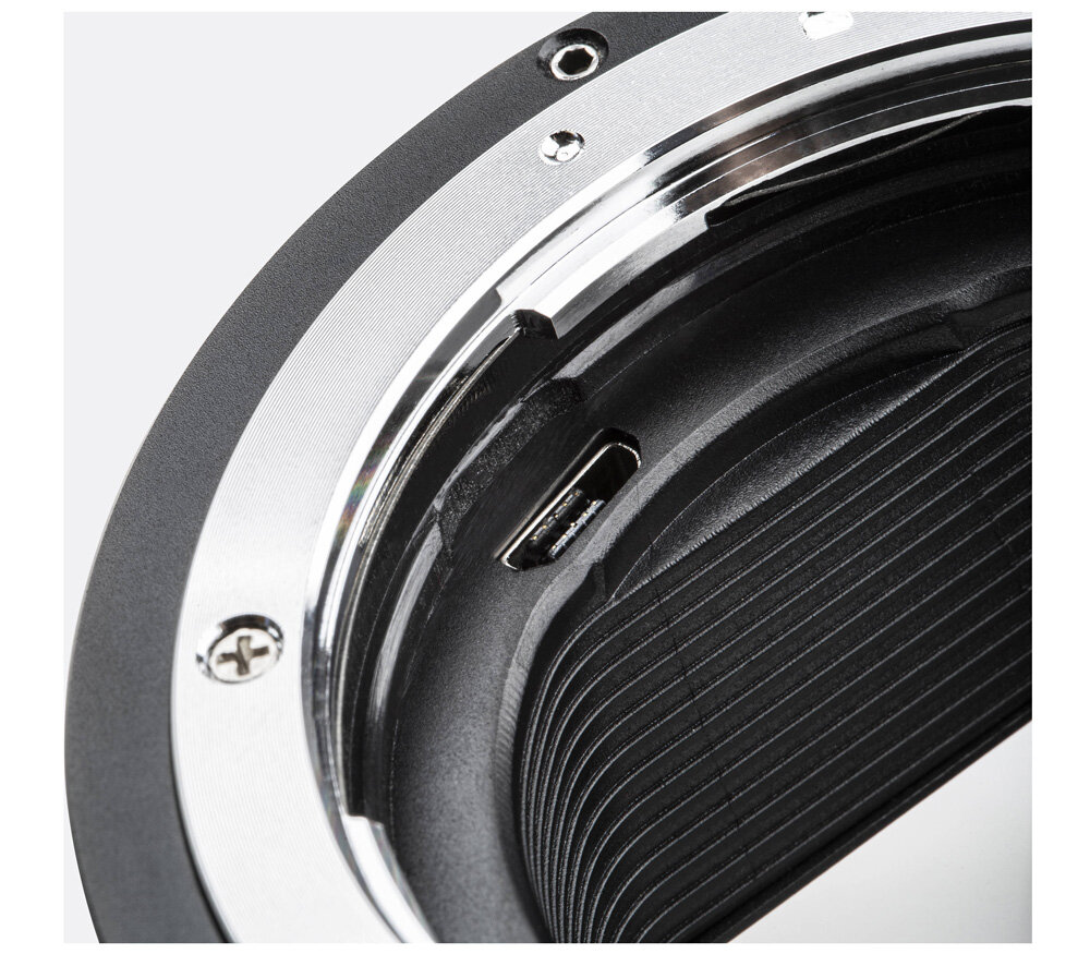 Автофокусный адаптер Viltrox EF-R2 является более продвинутой моделью, по сравнению с базовой EF-EOSR. Во-первых, на корпусе адаптера располагается управляющее кольцо, которое можно привязать к одной из настроек камеры по вашему выбору: ISO, компенсация экспозиции, диафрагма, выдержка, и так . Во-вторых, наличие USB позволяет пользователям самостоятельно обновлять прошивку адаптера. Конечно, поддерживаются все функции объектива, включая автофокус, автоматическую экспозицию, оптическую стабилизацию в объективе и передачу EXIF мета-данных. Данный адаптер выполнен в металлическом корпусе.