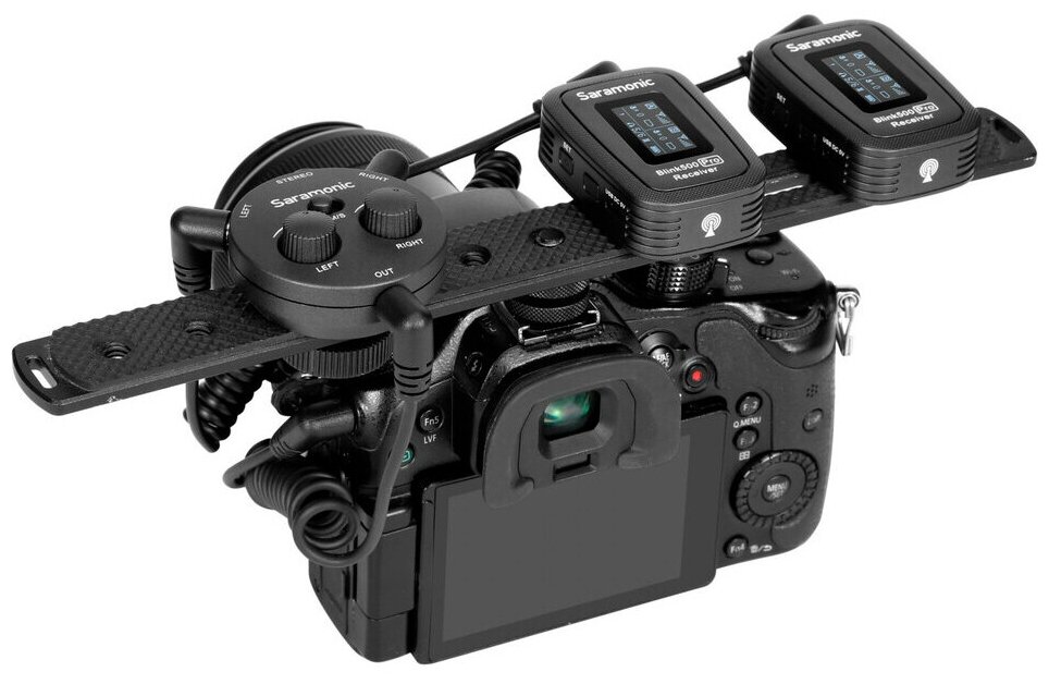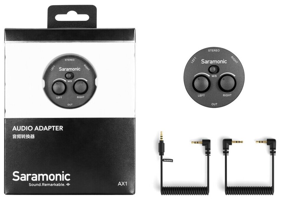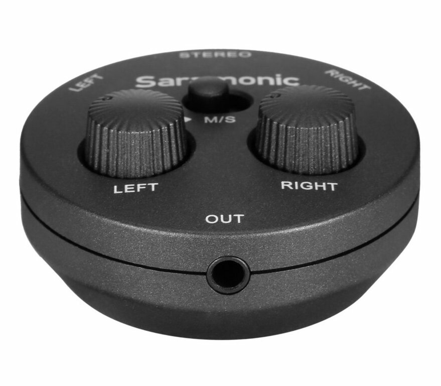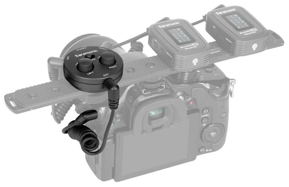 Накамерный пассивный микшер (аудиоадаптер) Saramonic AX1 позволяет сводить 2 отдельных источника с раздельной регулировкой уровня звука. Переключатель «моно / стерео» дает возможность выбора: свести 2 источника в моно на оба канала или вывести их раздельно. Поскольку данный микшер является пассивным, он работает только с микрофонами, имеющими собственный источник питания, а также с радиосистемами. По сути, он может только приглушать, а не усиливать один канал относительно другого. С другой стороны, он не увеличивает уровень шума, так как в схеме нет предусилителей.Микшер устанавливается на стандартный штативный винт 1/4". Его также можно поставить в башмак камеры – для этого потребуется докупить простой переходник. В комплекте 2 кабеля: 3.5 TRS для подключения к камере и 3.5 TRRS для подключения к гарнитурному гнезду смартфона или комбинированному входу ноутбука или ПК.