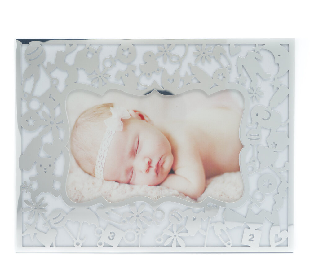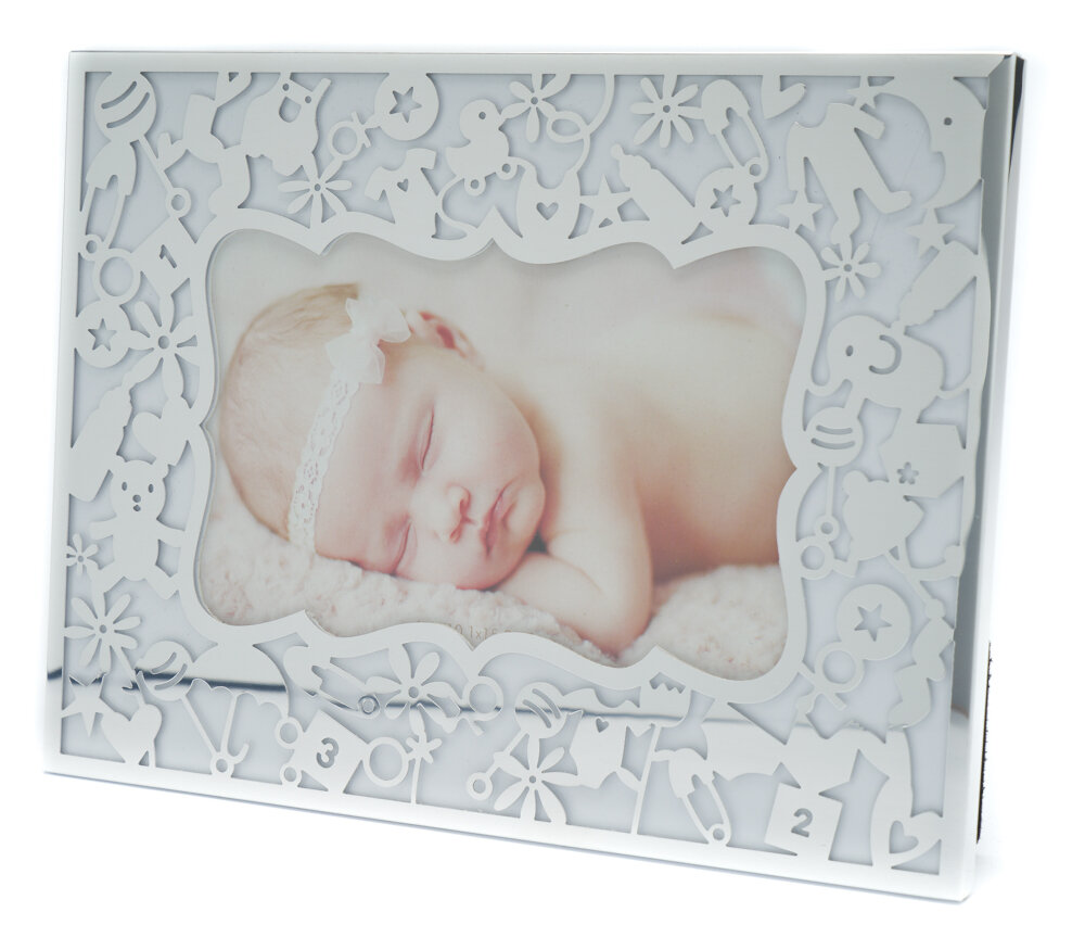 Металлическая фоторамка в тонком багете c глянцевой серебристой поверхностью и узором в виде детских игрушек на белом фоне. Подходит для фотографий формата 10х15 см. Стекло минеральное, прочное (толщина 1.5 мм), задник выполнен из плотного листа оргалита с отделкой бархатной тканью, имеется ножка для установки на стол, полку или любую другую ровную поверхность. Также имеется крепление для подвеса на стену. Интересный дизайн рамки хорошо подходит для фотографий первых лет жизни ребенка.Фотография устанавливается очень просто: задник выдвигается, снимок укладывается на стекло, и задник задвигается обратно по пазам в профиле, плотно прижимая фото к поверхности стекла. Рамка может устанавливаться как вертикально, так и горизонтально, а подвешиваться – только вертикально. Бренд Fotografia объединяет под собой коллекции фотоальбомов и рамок. Рамки Fotografia с вашими любимыми снимками станут отличным украшением любого интерьера.