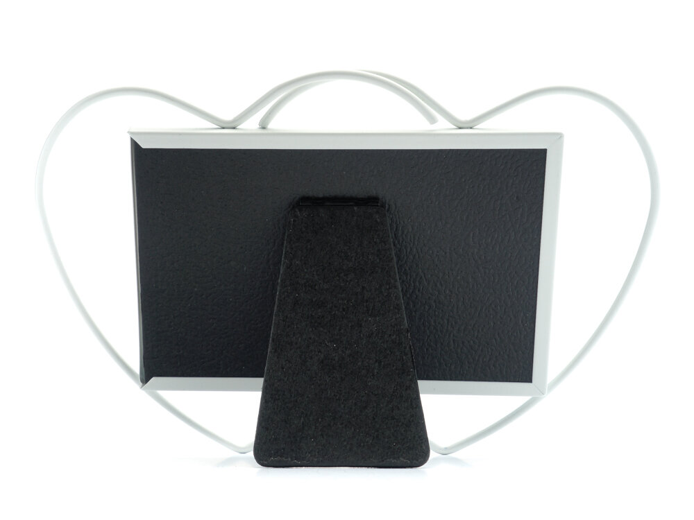 Стильная металлическая фоторамка белого цвета для фотографий формата 10х15 см. Сзади имеется ножка-подставка для установки на горизонтальную поверхность.