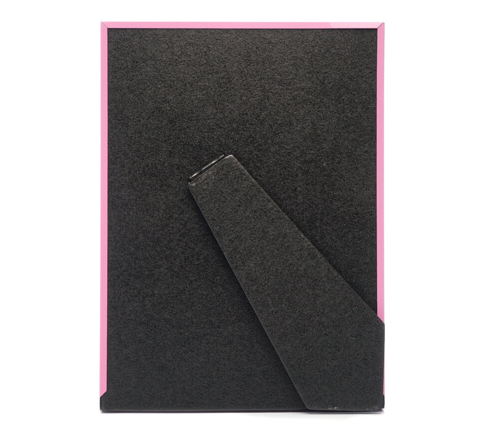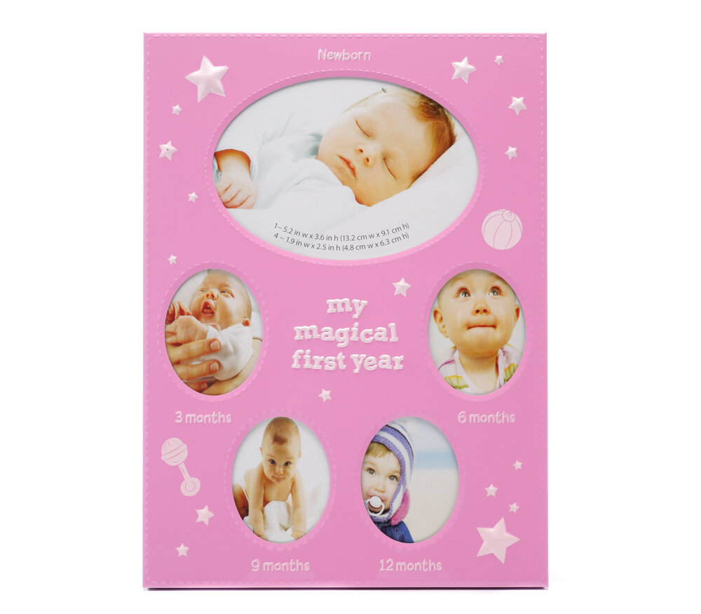Розовая металлическая фоторамка для 4 маленьких фотографий 5х6 см и одной большой 9х13 см. Сзади имеется ножка-подставка для размещения на столе, полке или любой другой ровной поверхности. Рамка предназначена для фотографий первого года жизни ребенка: рождение, по 1 снимку на 3, 6, 9 и 12 месяцев со дня рождения, сверху – большая фотография новорожденного. Рамка украшена узорами из звездочек, погремушки и мячика. Стекло минеральное, прочное (толщина 1.5 мм), задник выполнен из плотного листа оргалита. Имеется ножка для установки на стол, полку или любую другую ровную поверхность.Фотографии устанавливаются очень просто: задник выдвигается, снимок укладывается на стекло, и задник задвигается обратно по пазам в профиле, плотно прижимая фото к поверхности стекла. Данная рамка подходит только для горизонтального размещения, подвесное крепление также не предусмотрено. Бренд Fotografia объединяет под собой коллекции фотоальбомов и рамок. Рамки Fotografia с вашими любимыми снимками станут отличным украшением любого интерьера.
