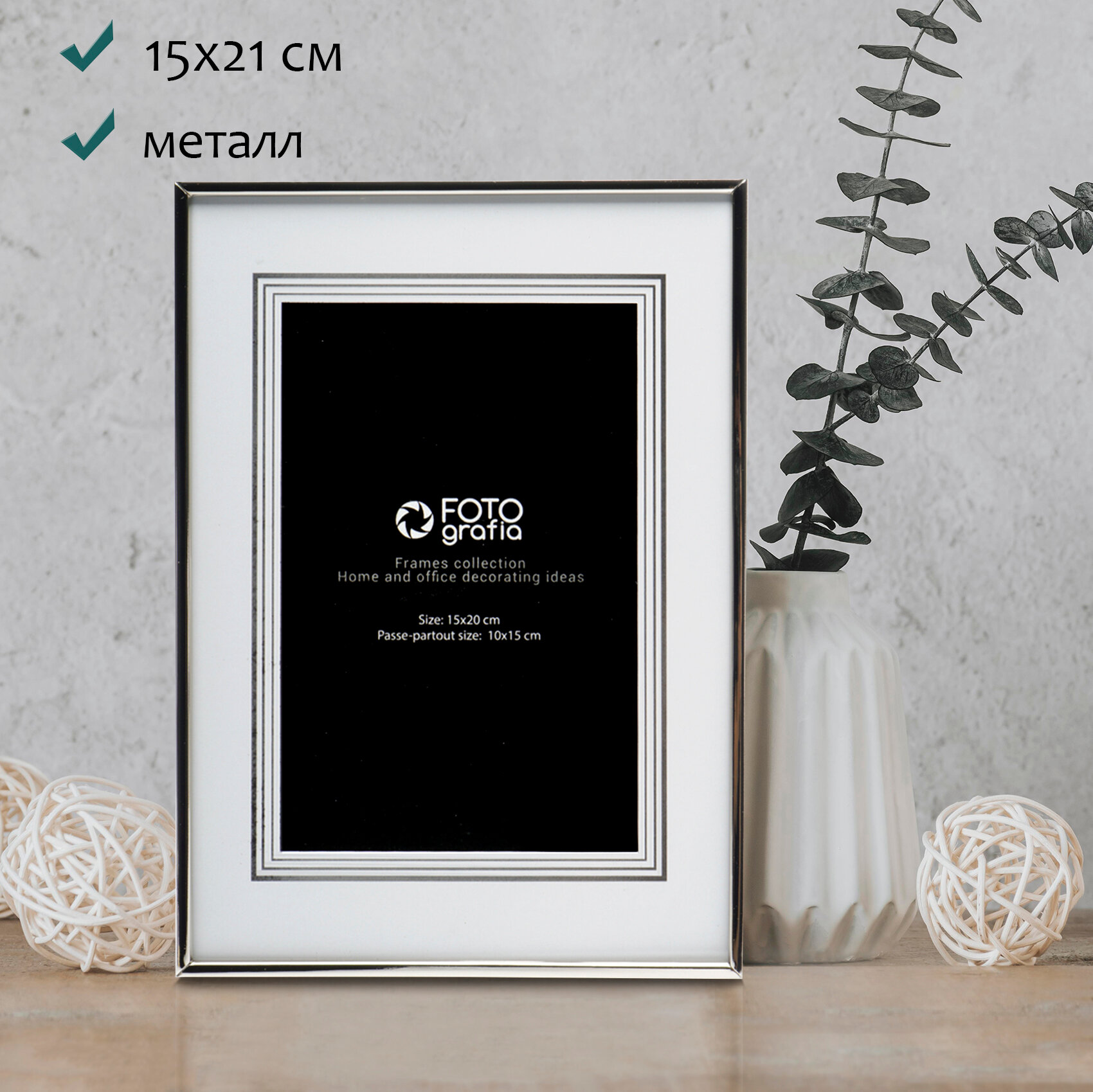 Премиальная металлическая рамка для фотографий формата 15х21 см или 10х15 см (с паспарту). Поверхность багета глянцевая, зеркальная, стекло минеральное, прочное (толщина 1.5 мм). Задник из плотного листа оргалита, предусмотрена ножка для размещения рамки на столе или полке: как вертикально, так и горизонтально.Фотография устанавливается очень просто: задник полностью выдвигается из пазов профиля, фото укладывается на стекло и задник задвигается обратно. Конструкция обеспечивает прочное прилегание листа к стеклу. Соединение углов багета выполнено с помощью особых крепежей, незаметно располагаемых внутри профиля. Это обеспечивает плотную и точную фиксацию сторон багета друг к другу. Дизайн фоторамки универсальный, он может использоваться практически с любыми интерьерами. Помимо фотографий в такой рамке можно разместить детские рисунки, открытки и так далее. Бренд Fotografia объединяет под собой коллекции фотоальбомов и рамок. Рамки Fotografia с вашими любимыми фотографиями станут отличным украшением любого интерьера.(возможна установка формата 10х15 см, с паспарту, которое не входит в комплект).