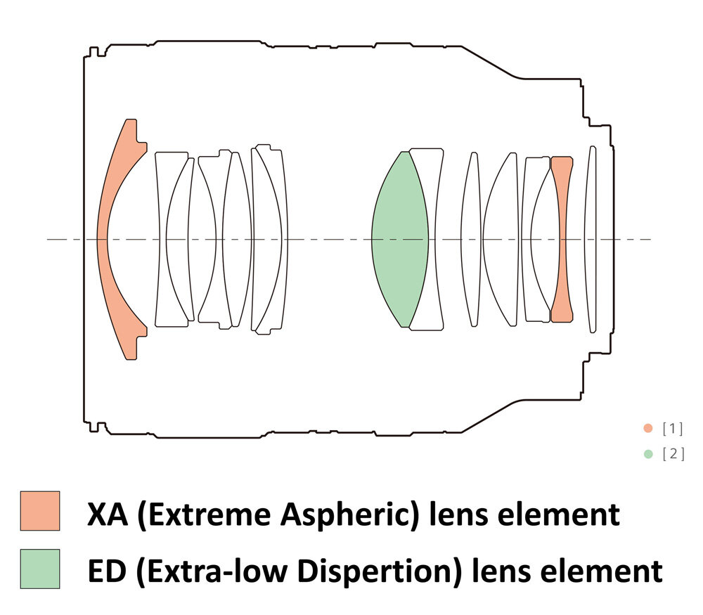 Модель оснащена 14 элементами в 10 группах. Благодаря этому достигается высокая четкость изображения. Оптическая схема включает два асферических элемента, которые эффективно устраняют сферические аберрации. Также есть три линзы со сверхнизким показателем дисперсии, которые минимизируют хроматические аберрации. Кроме того, объектив имеет: