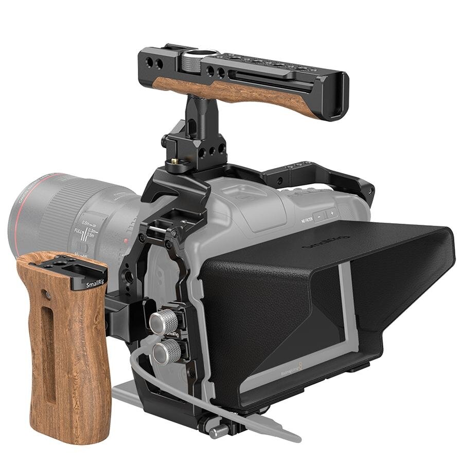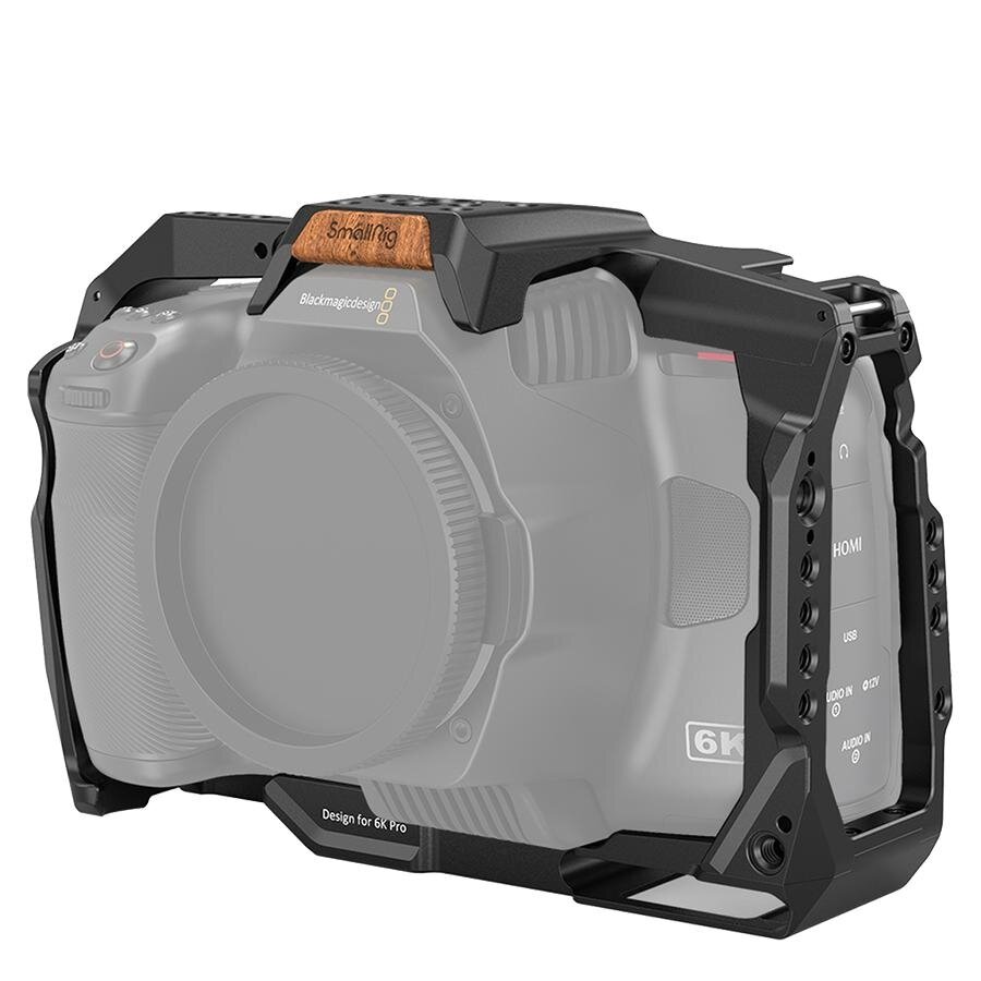 Комплект SmallRig 3299 Professional Accessory Kit для камеры Blackmagic BMPCC 6K Pro включает клетку 3270, бленду ЖК монитора 3273, фиксатор для кабелей 3271, крепление для SSD диска Samsung T5 3300, верхнюю деревянную рукоятку HTN2362, боковую деревянную рукоятку 2187, планку НАТО 2172 и защитное стекло для экрана (2 шт.) 3274.