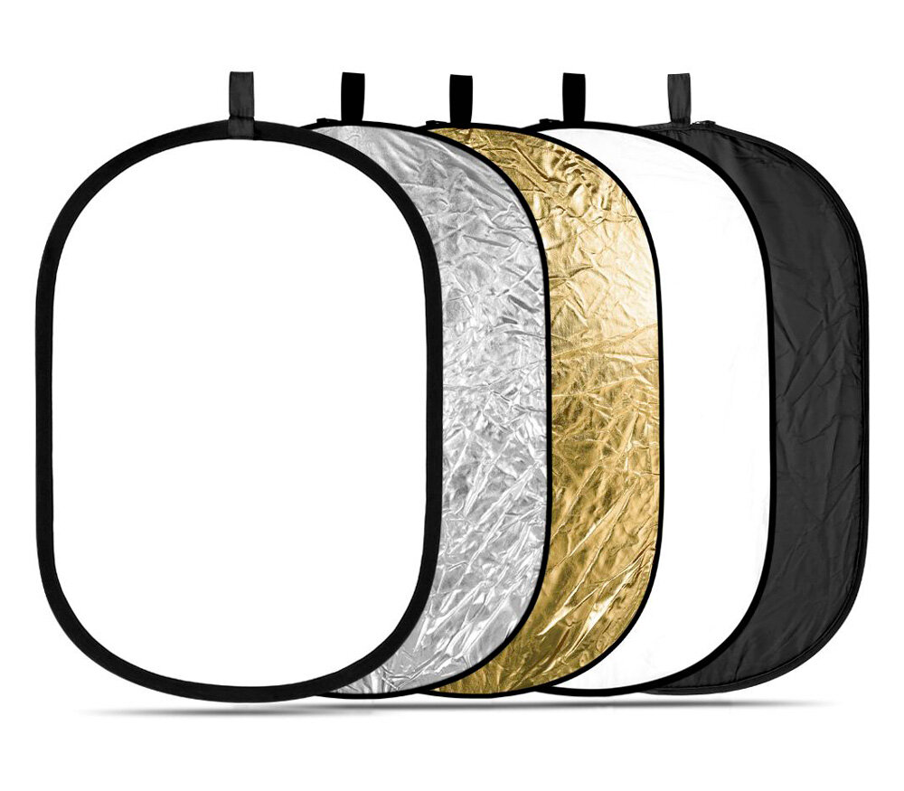 Овальный складной отражатель 5 в 1: белый, черный, серебристый, золотой, на просвет. Отражатель 5 в 1 позволяет дополнительно подсветить объект съемки, рассеять свет от жесткого источника или блокировать лишний свет для большей контрастности и драматизма. Размеры 120 х 180 см, при переноске отражатель складывается в небольшой чехол.