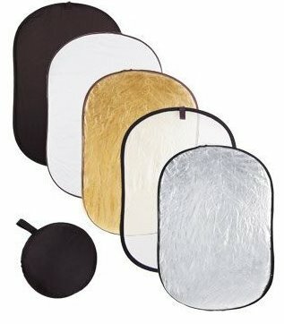 Овальный складной отражатель 5 в 1: белый, черный, серебристый, золотой, на просвет. Отражатель 5 в 1 позволяет дополнительно подсветить объект съемки, рассеять свет от жесткого источника или блокировать лишний свет для большей контрастности и драматизма. Размеры 150 х 200 см, при переноске отражатель складывается в небольшой чехол.